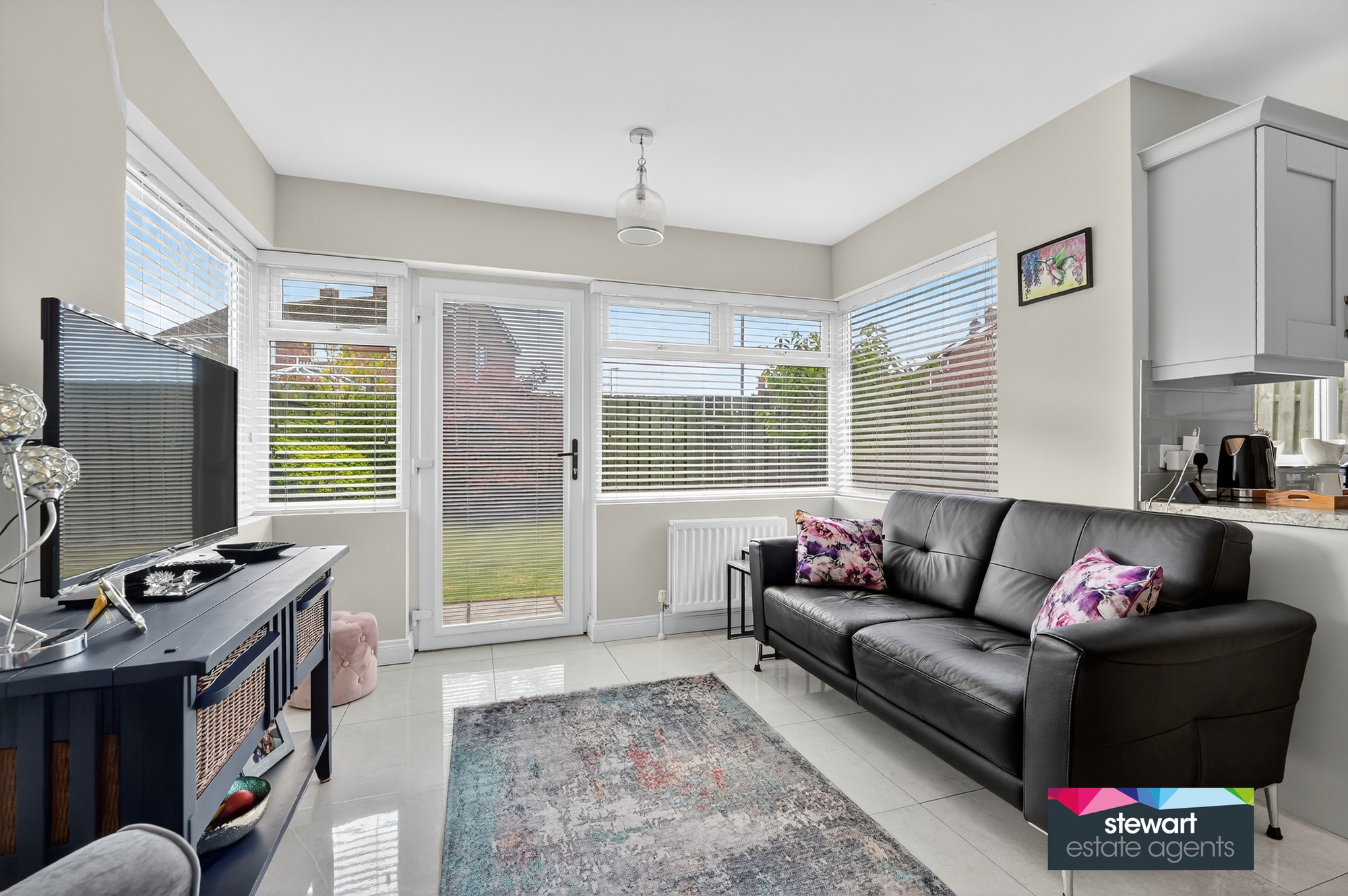 Open plan kitchen with dining area and family area, having a PVC double glazed door leading to the rear garden