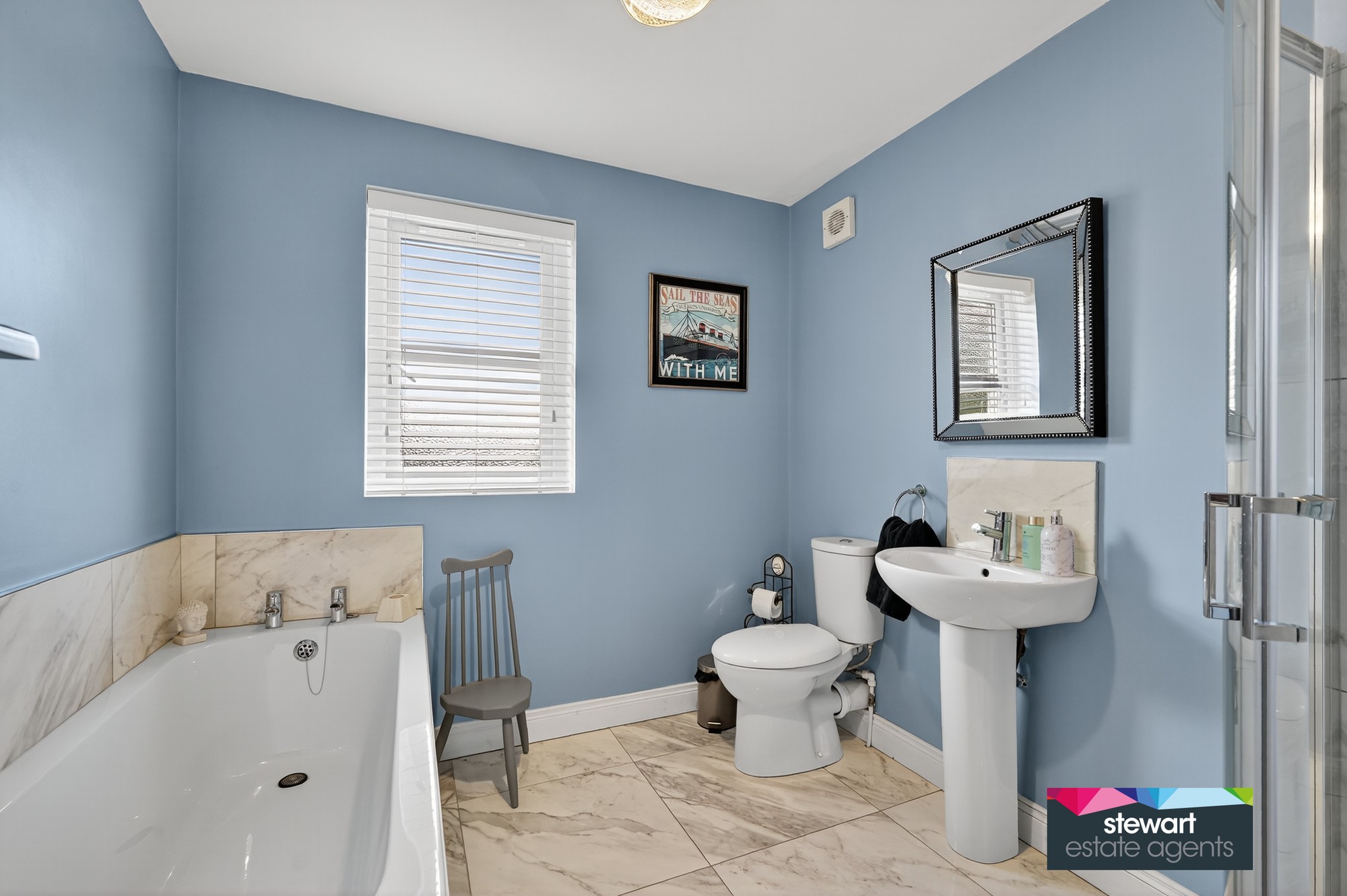 Bathroom on the first floor with a modern white suite including a bath, WC and wash hand basin, shower cubicle with shower fitment
