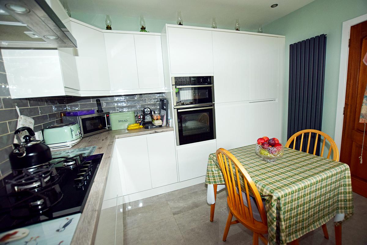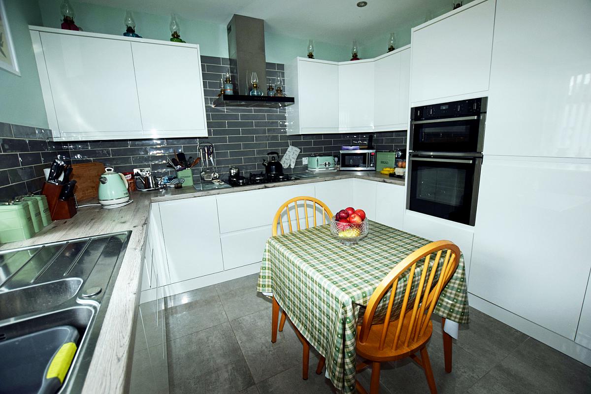With fully fitted extensive range of eye and low level units with tiling between and under lighting, one and a half bowl stainless steel sink unit, integrated hob with extractor fan, integrated eye level oven, integrated fridge/freezer, recessed lights and tiled floor.