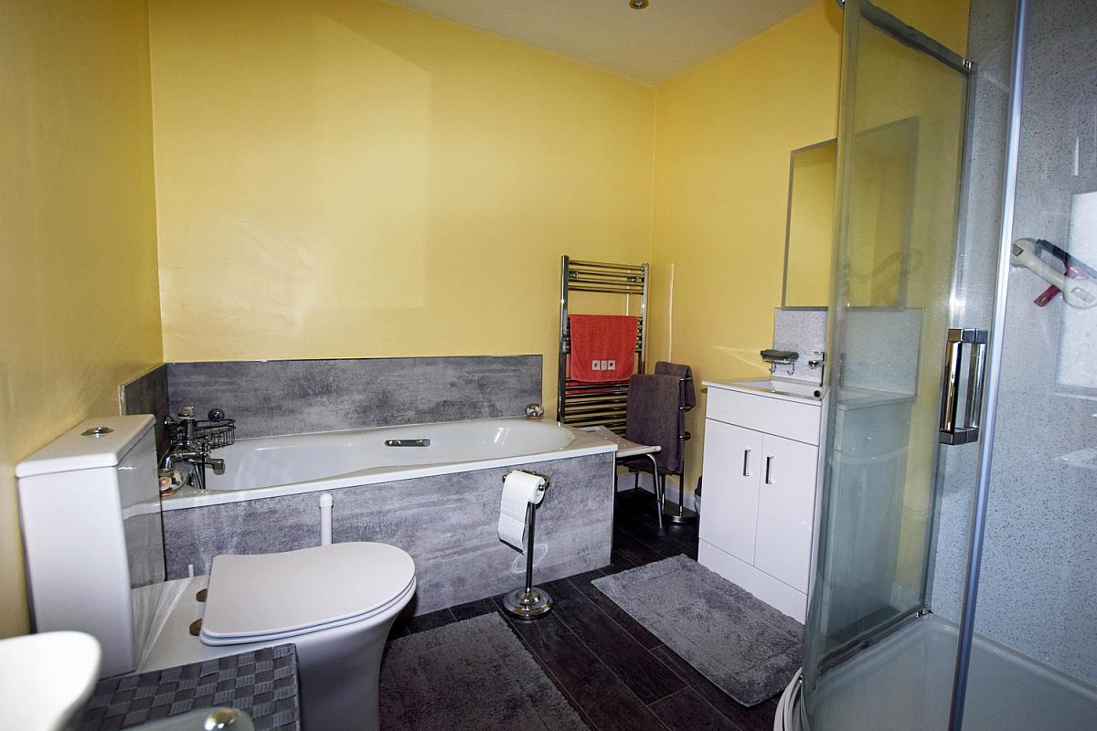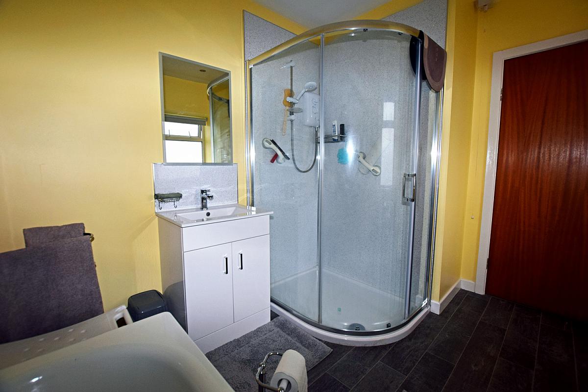 Suite comprising PVC panelled walk in shower cubicle, bath with splash back, wash hand basin with splash back and under storage, wc, recessed lights.