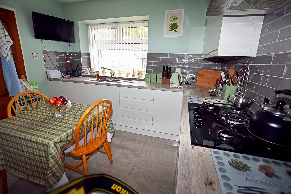 With eye and low level units, stainless steel sink unit, space for tumble dryer, plumbed for washing machine, tiled flooring, separate wc and wash hand basin. Measurements to widest points.