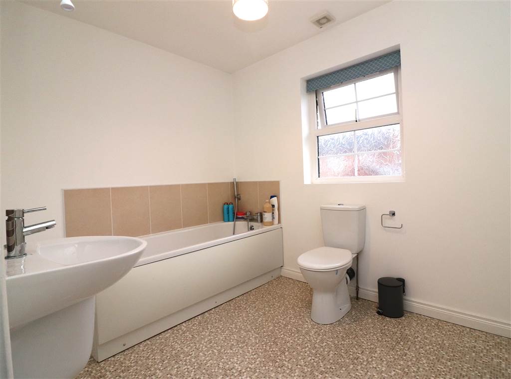 White suite. Panelled bath with mixer taps and shower attachment. Pedestal wash hand basin. Low flush WC. Extractor fan.