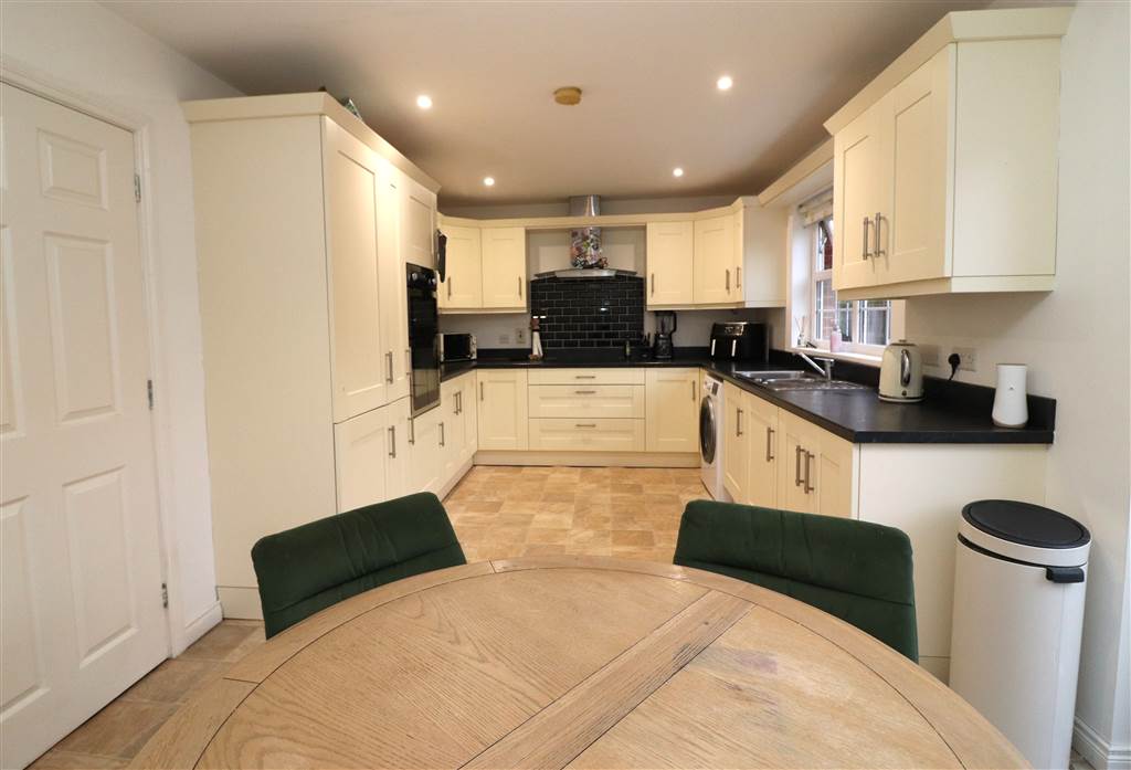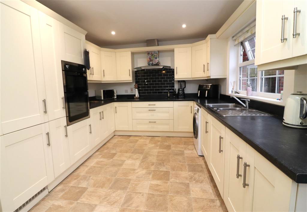 Excellent range of high and low level units. One and a half bowl stainless steel sink unit with mixer taps. Plumbed for washing machine. Built in hob and double oven. Integrated fridge/freezer. Extractor fan. Recessed lights. UPVC french doors to rear garden.