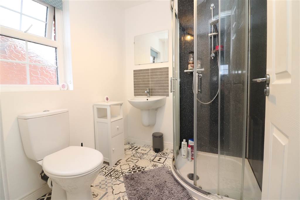 White suite. Shower cubicle with PVC wall panelling and thermostatically controlled shower. Wash hand basin. Low flush WC. Extractor fan.