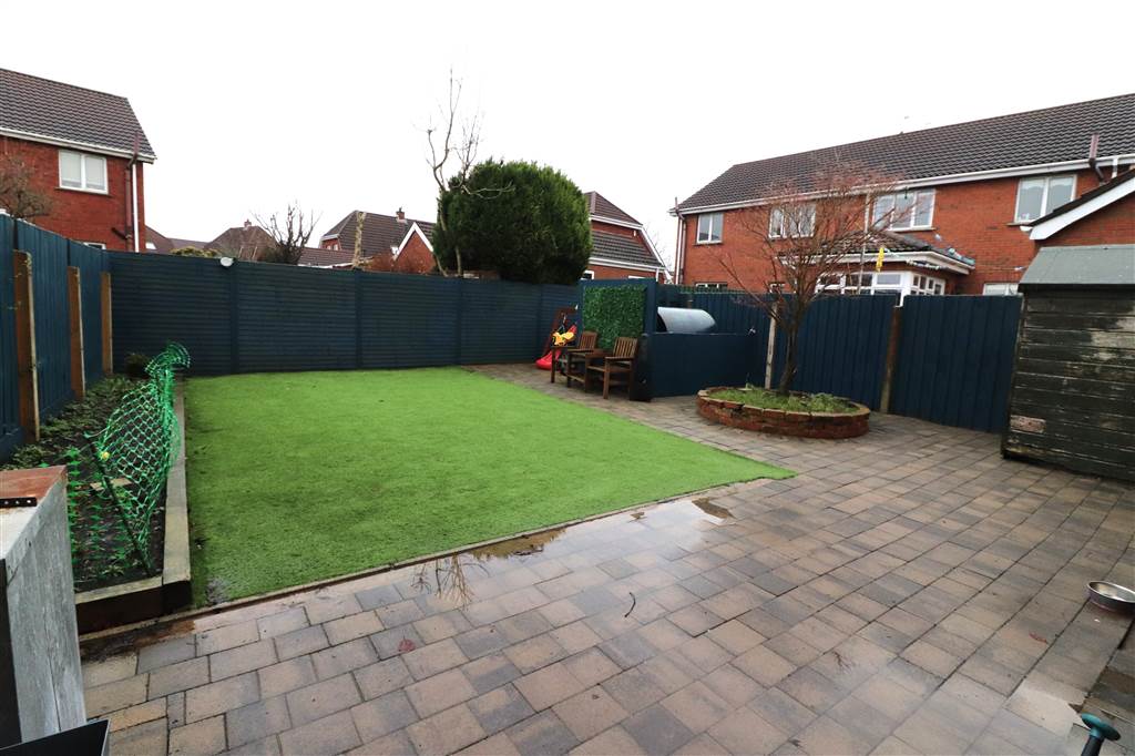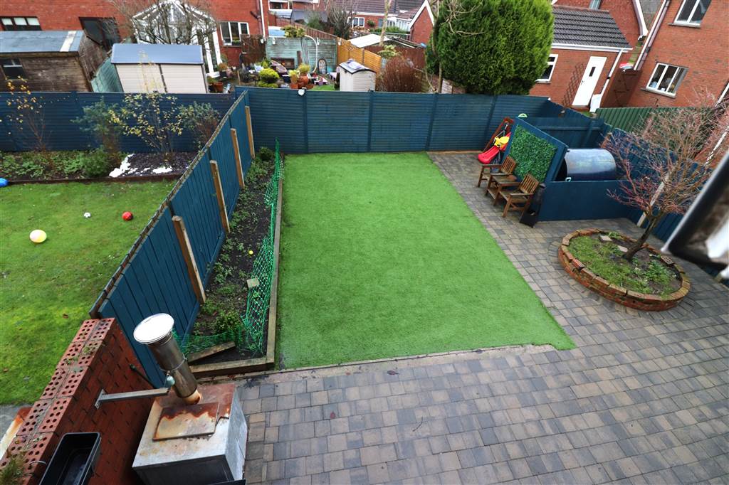 Spacious driveway. Front garden in lawn. Enclosed rear garden with artificial grass and paved patio area. Boiler house. Outside light and tap.