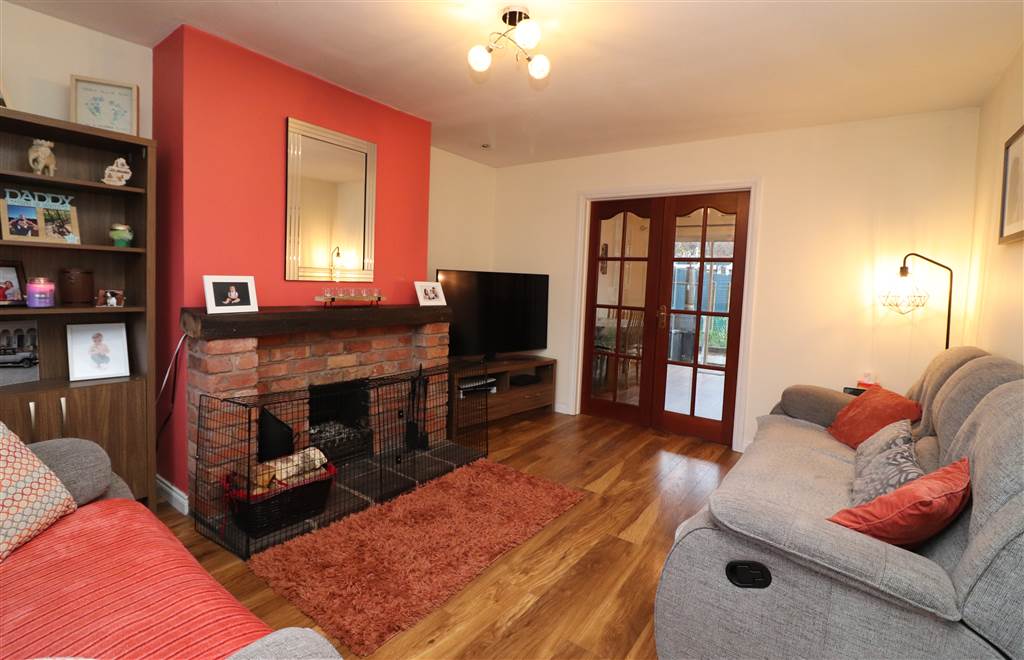 Feature reclaimed brick fireplace with open fire, back boiler and tiled hearth. Laminate floor. French doors to: