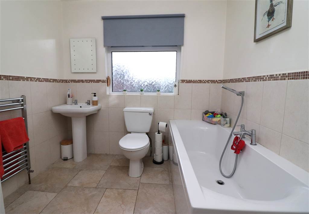 White suite. Panelled bath with mixer taps. Corner shower cubicle with Triton electric shower. Pedestal wash hand basin. Low flush WC. Part tiled walls. Tiled floor. Extractor fan.