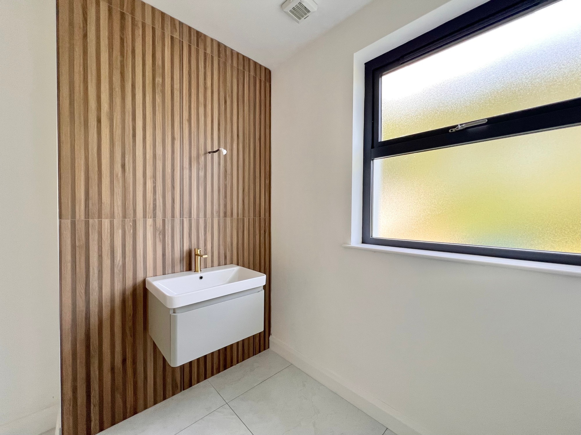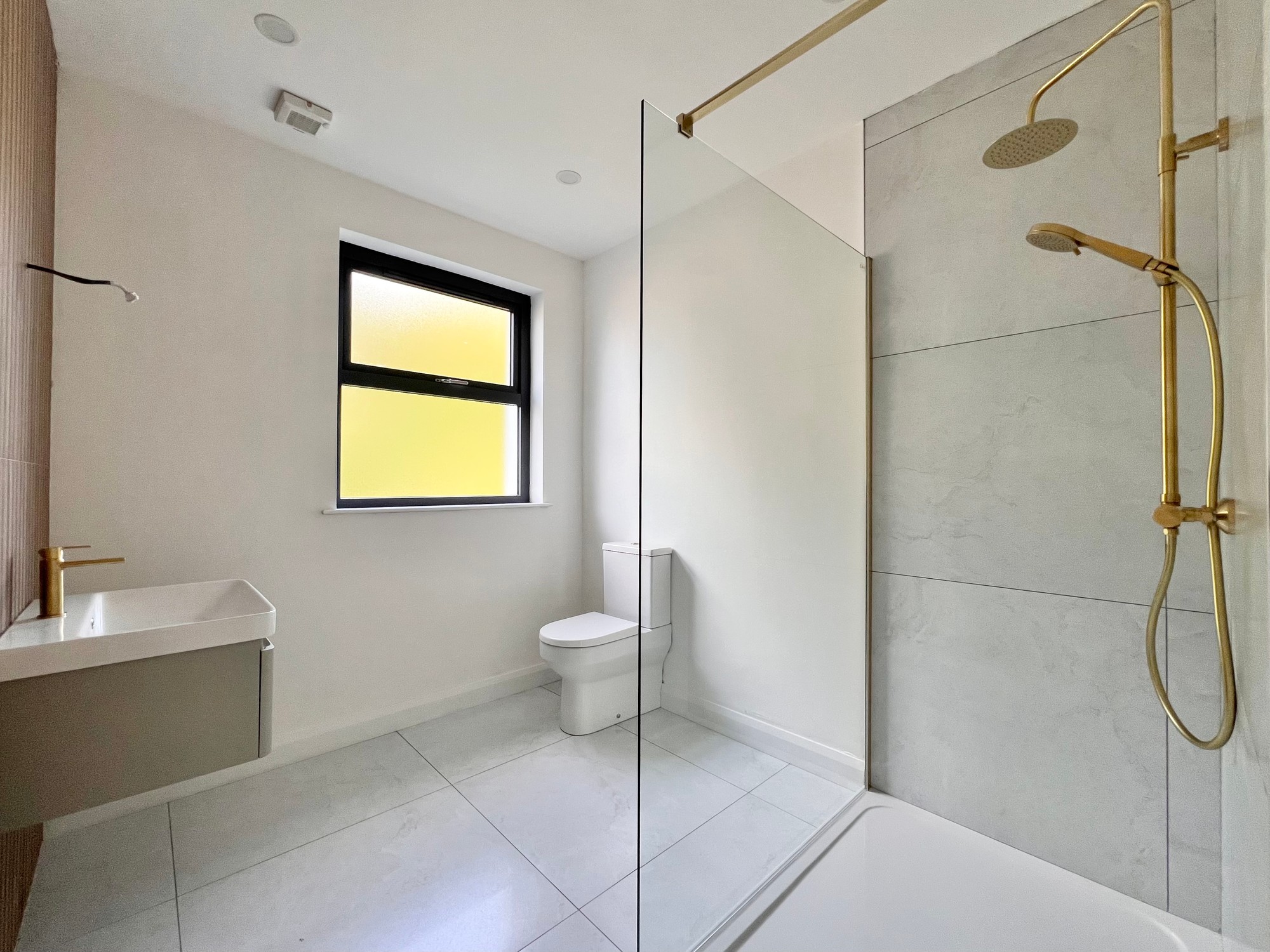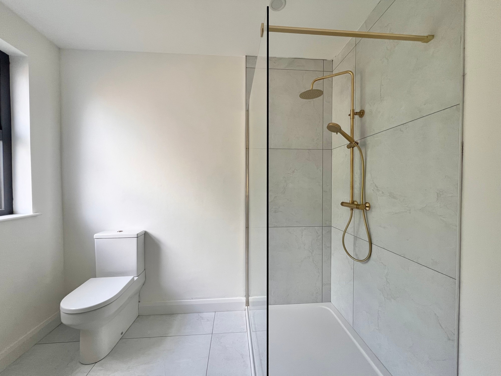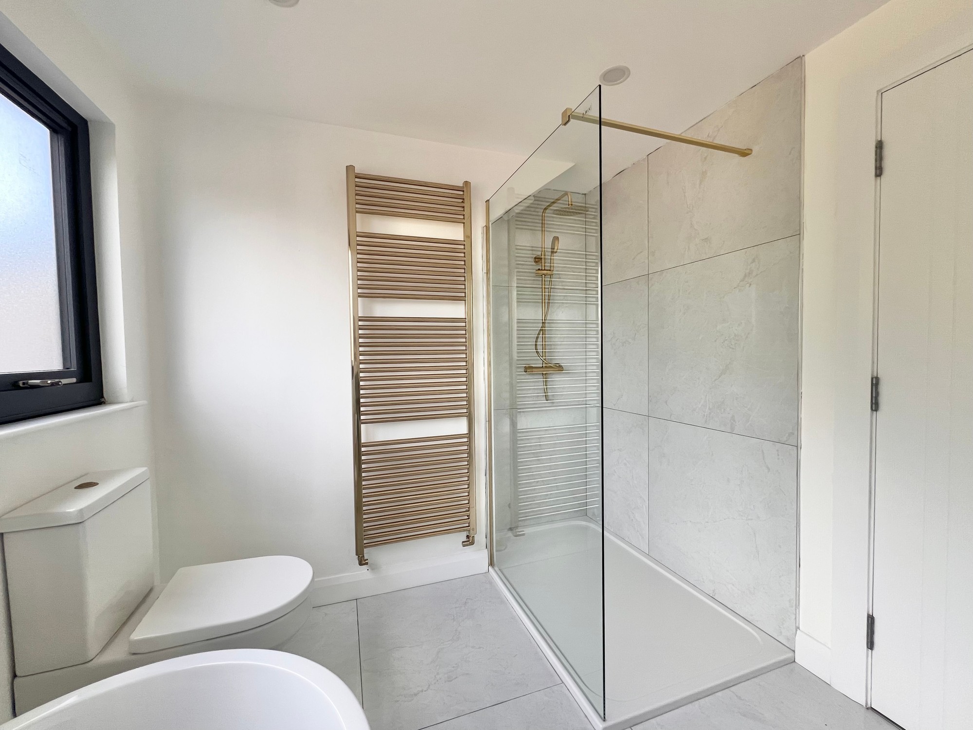 Contemporary three piece suite with brushed brass hardware comprising of wc, wall hung whb & vanity unit, shower with rainfall shower head, brushed bath towel rail, walls part tiled, floor fully tiled.