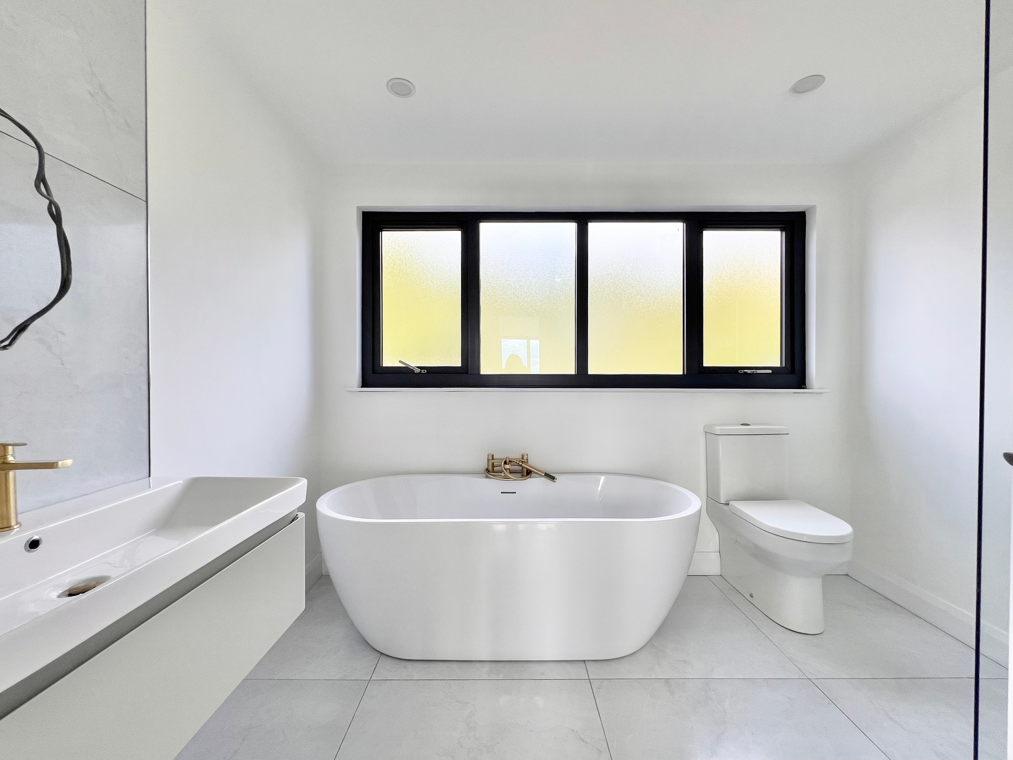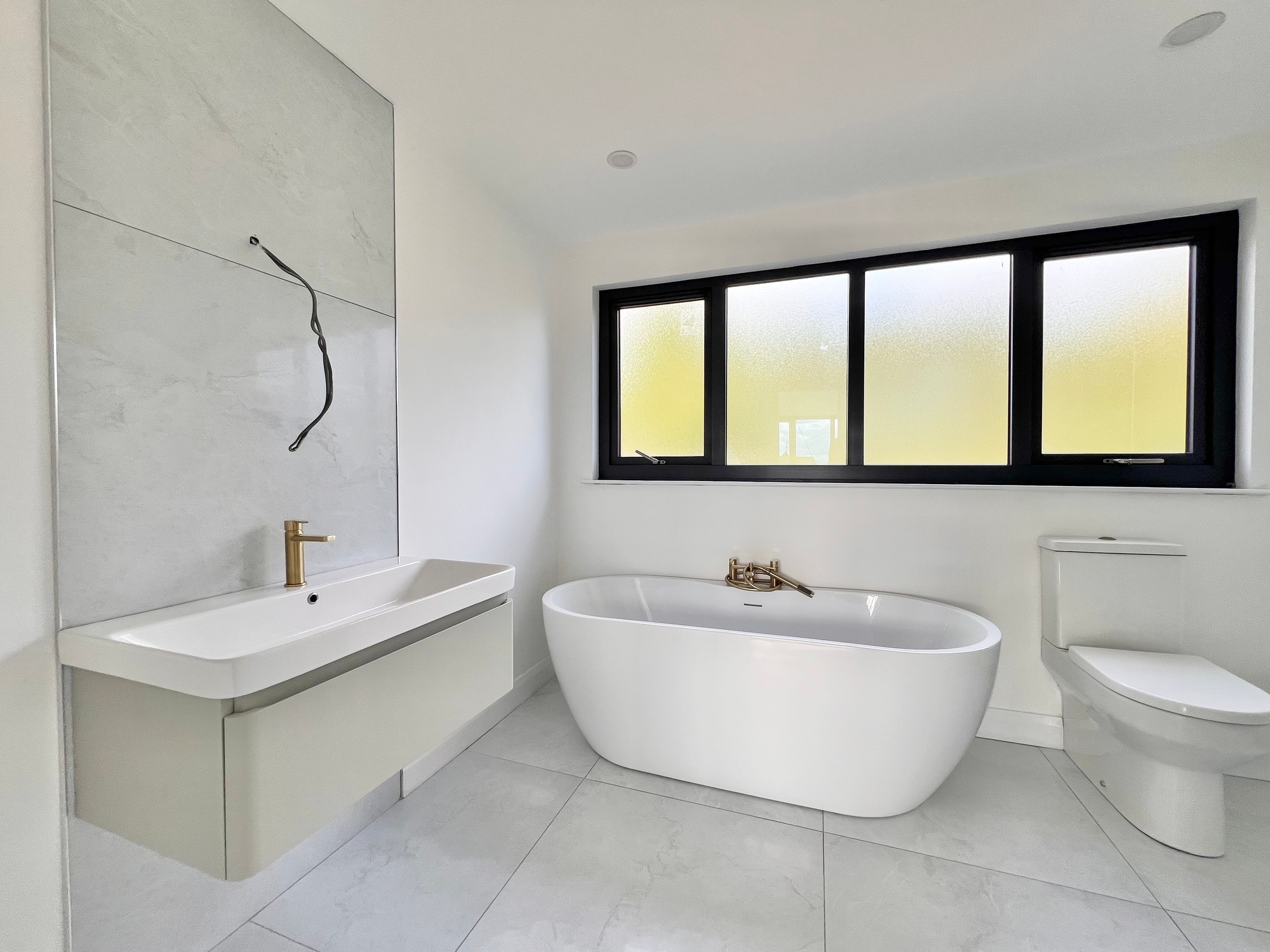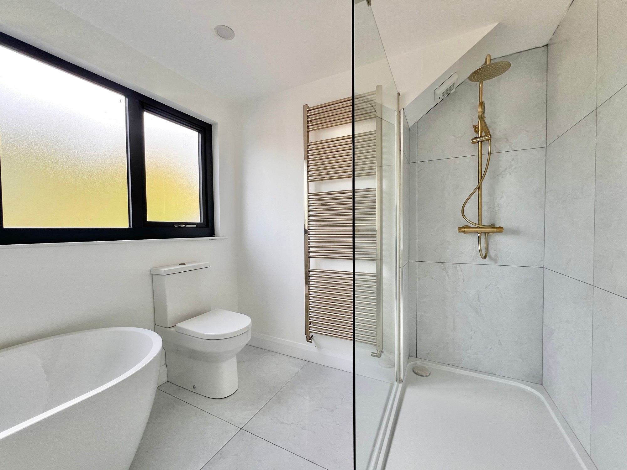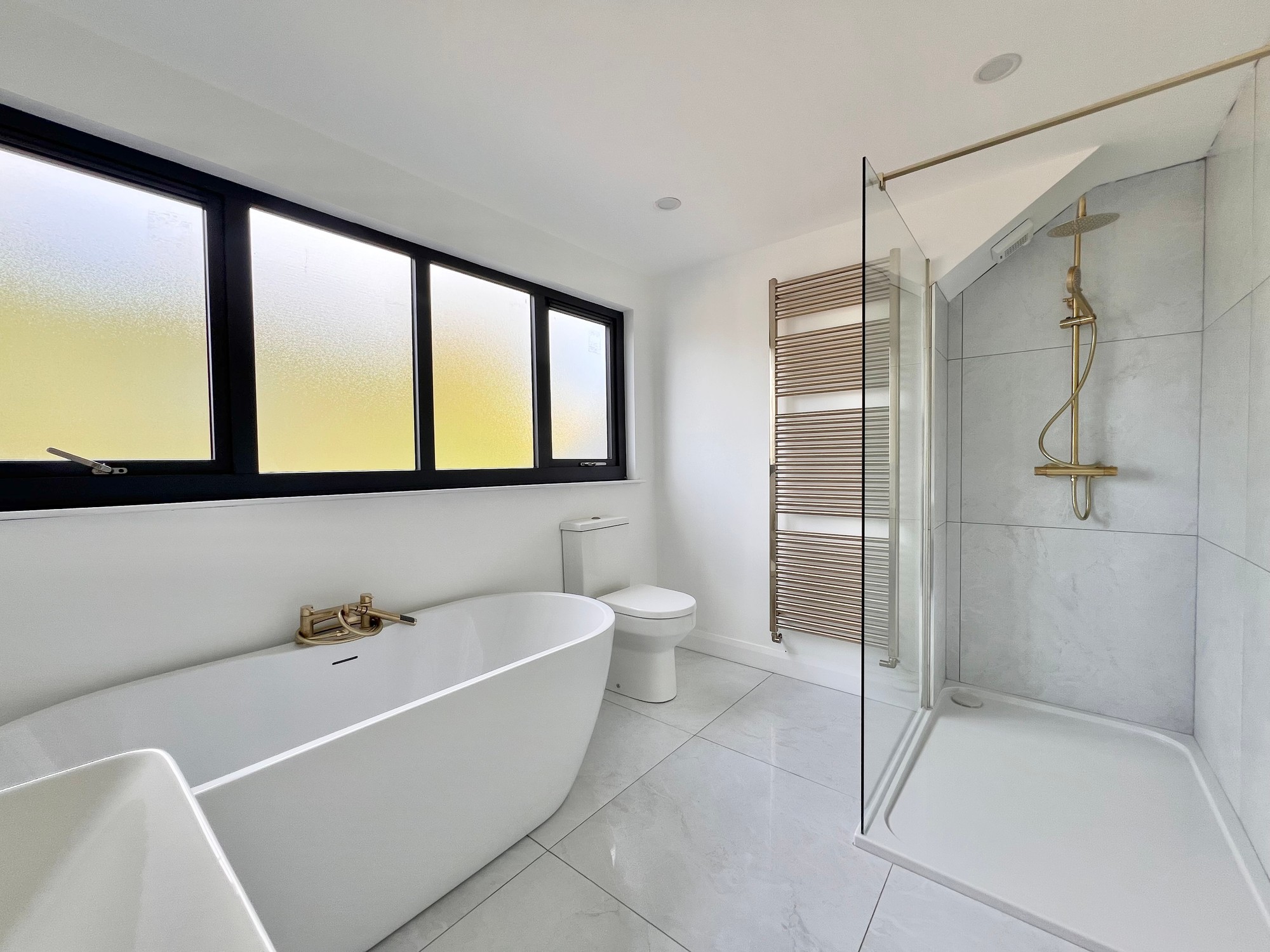Contemporary four piece suite with brushed brass hardware comprising of wc, wall hung whb & vanity unit, free standing bath, shower with rainfall shower head, brushed bath towel rail, walls part tiled, floor fully tiled.