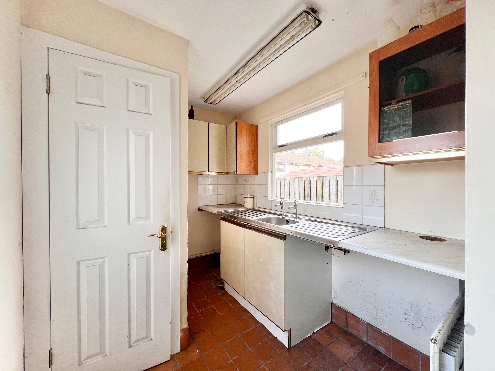 With eye & low level units, stainless steel sink & drainer unit, walls part tiled, dining area.