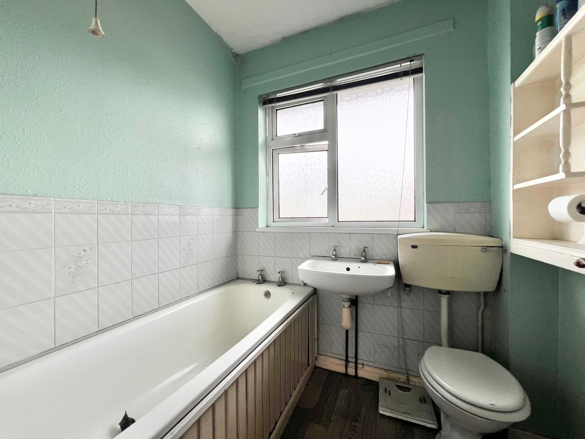 With wc, whb, bath, & separate electric shower, walls part tiled.