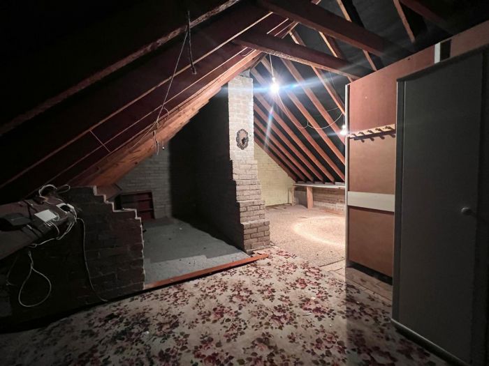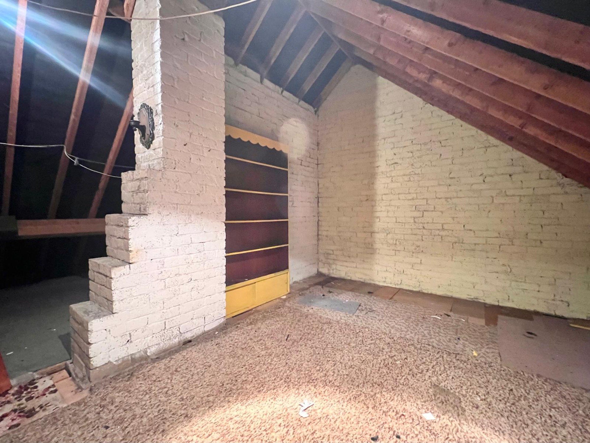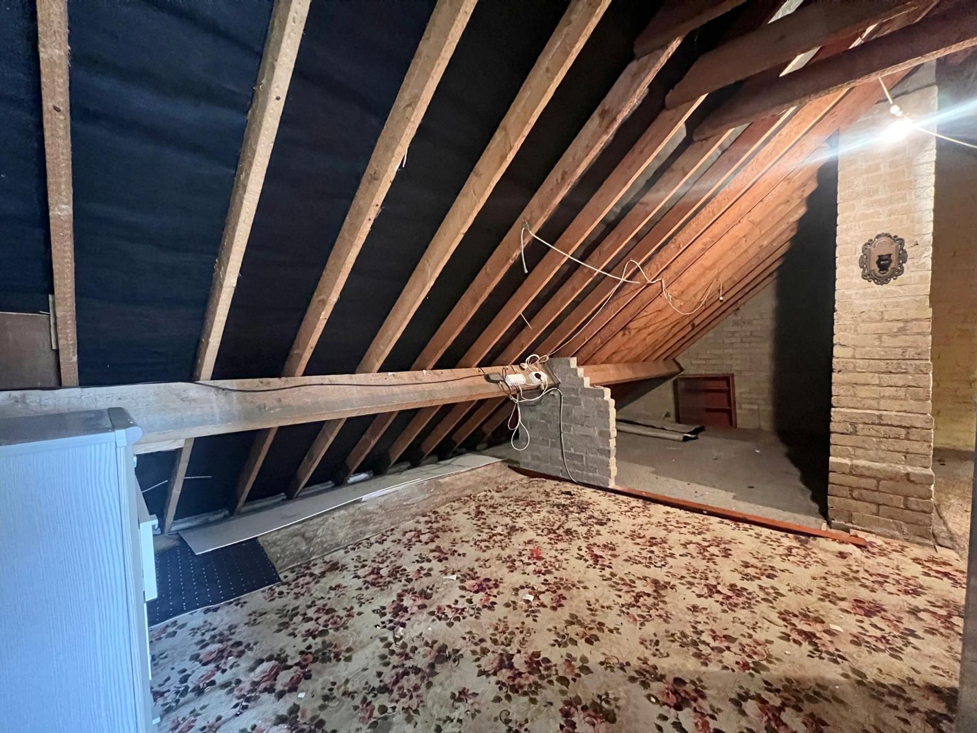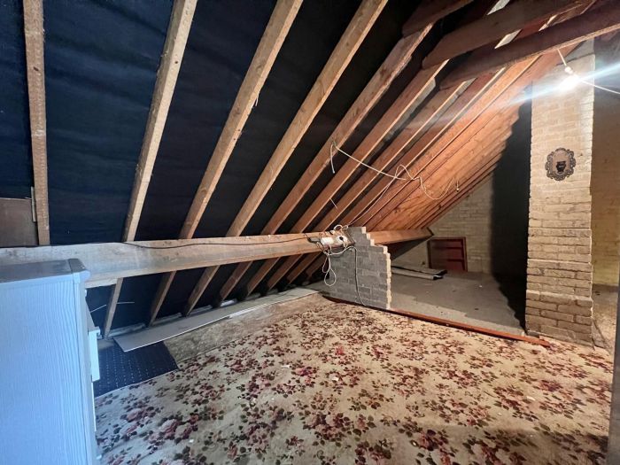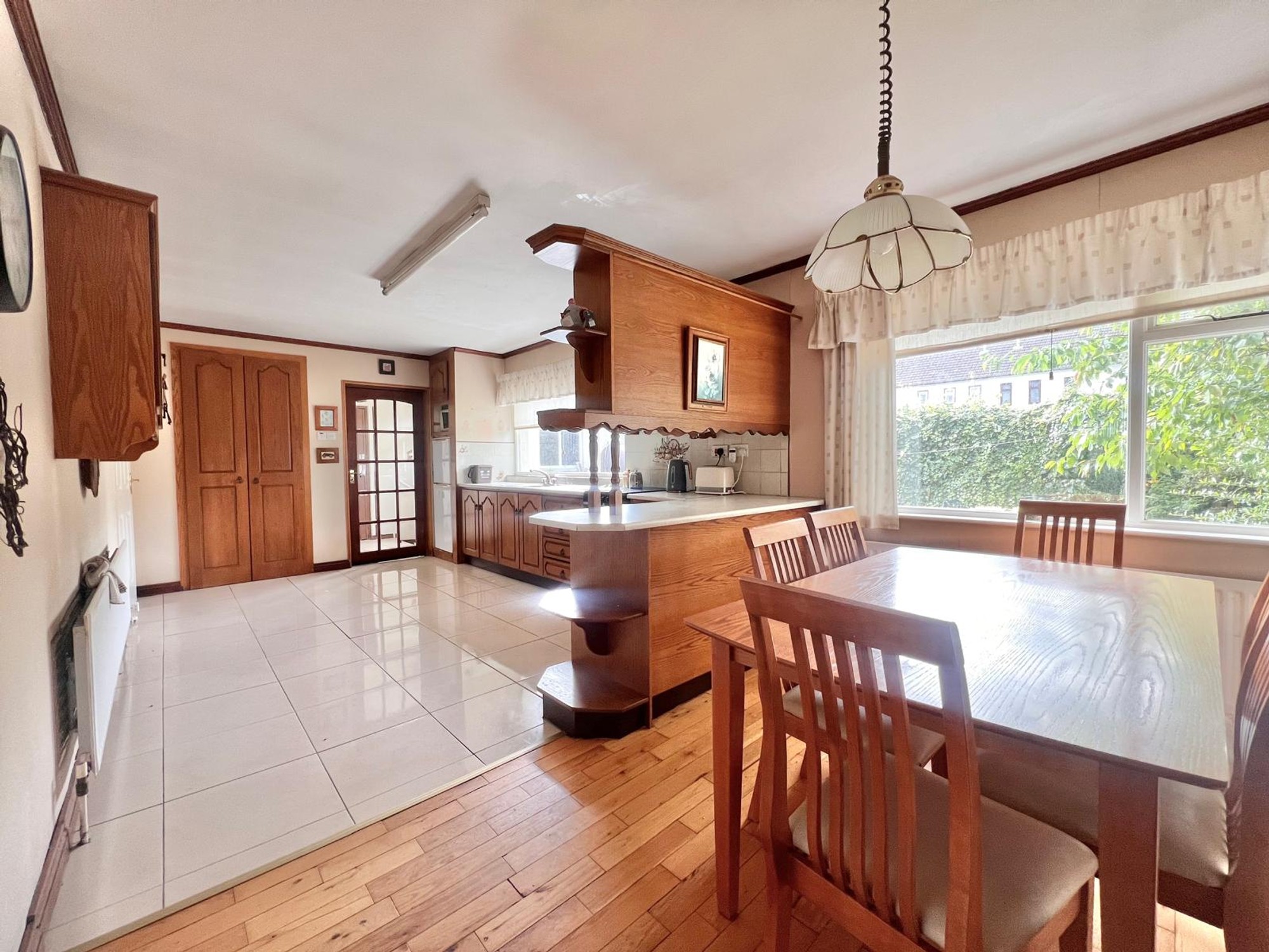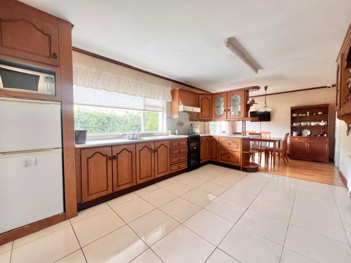 With eye and low level units, stainless steel sink & drainer unit, walls part tiled, floor part tiled, part wooden floor.