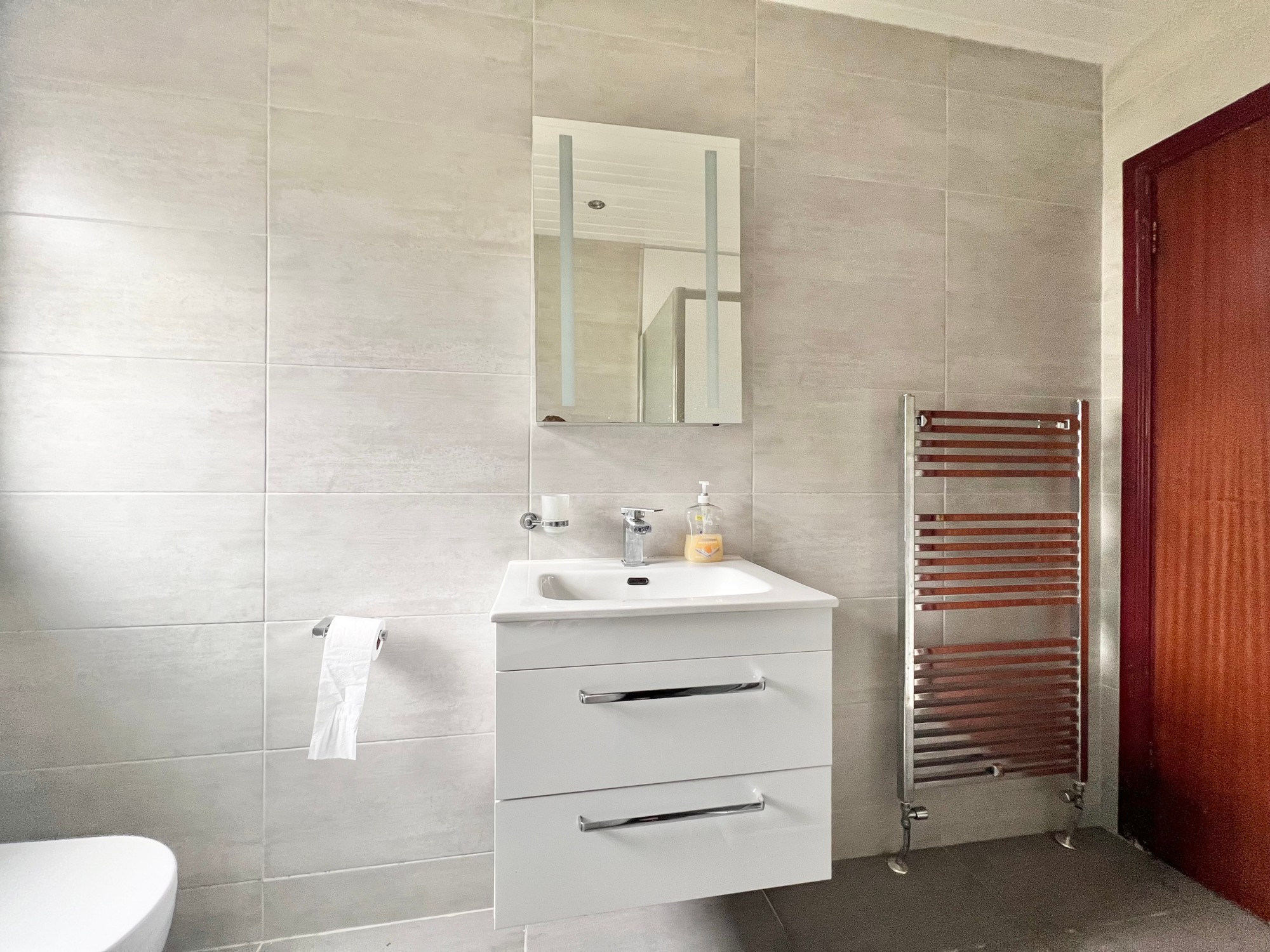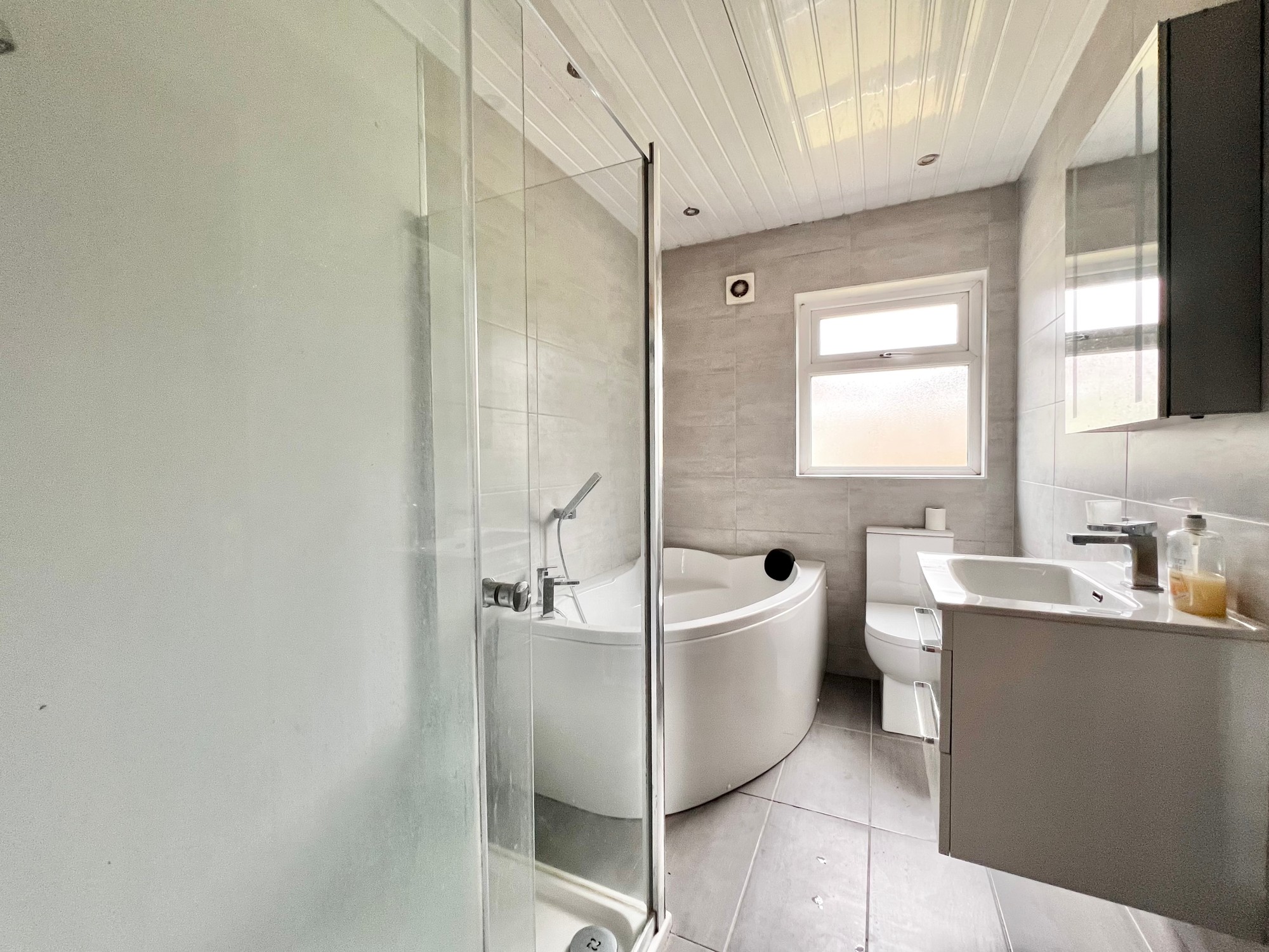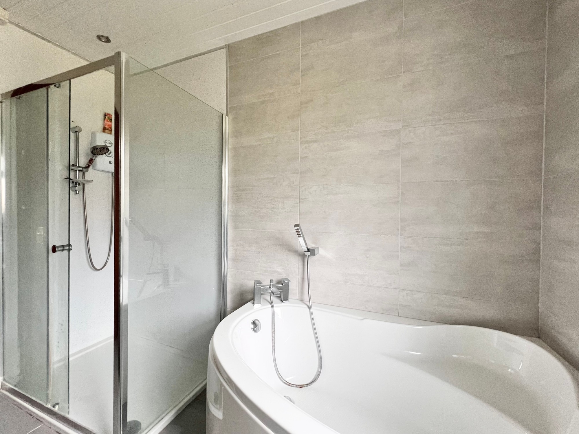 With wc, whb and vanity unit, corner bath & separate electric shower, recessed lights, walls part tiled, floor fully tiled.