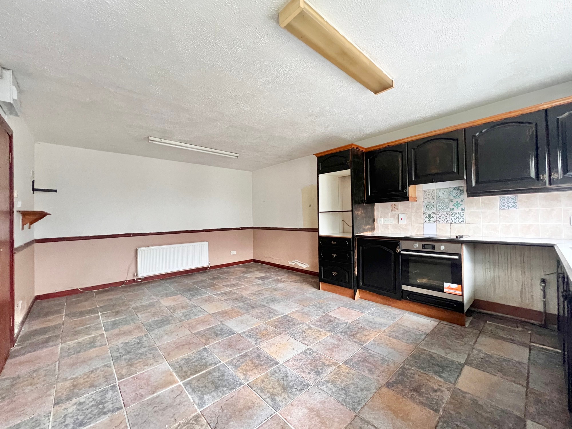 With eye and low level kitchen units, stainless steel sink and drainer unit, electric hob & oven, extractor fan, walls part tiled, floor fully tiled, dining & living area.