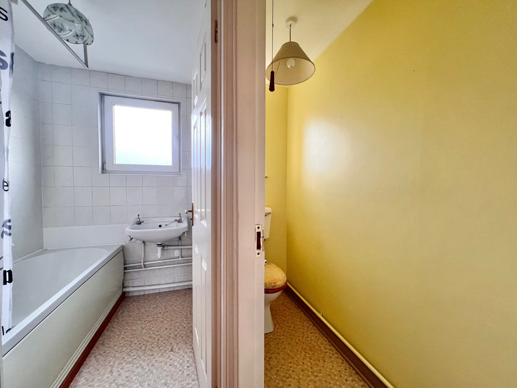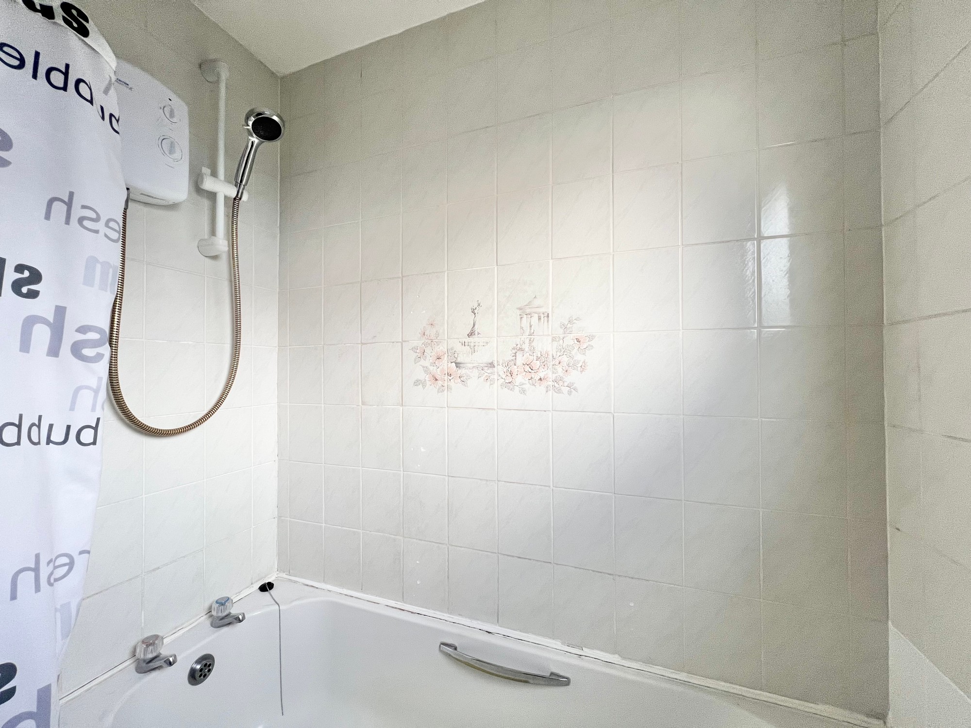 With whb, bath, electric shower over bath, walls part tiled, separate wc.