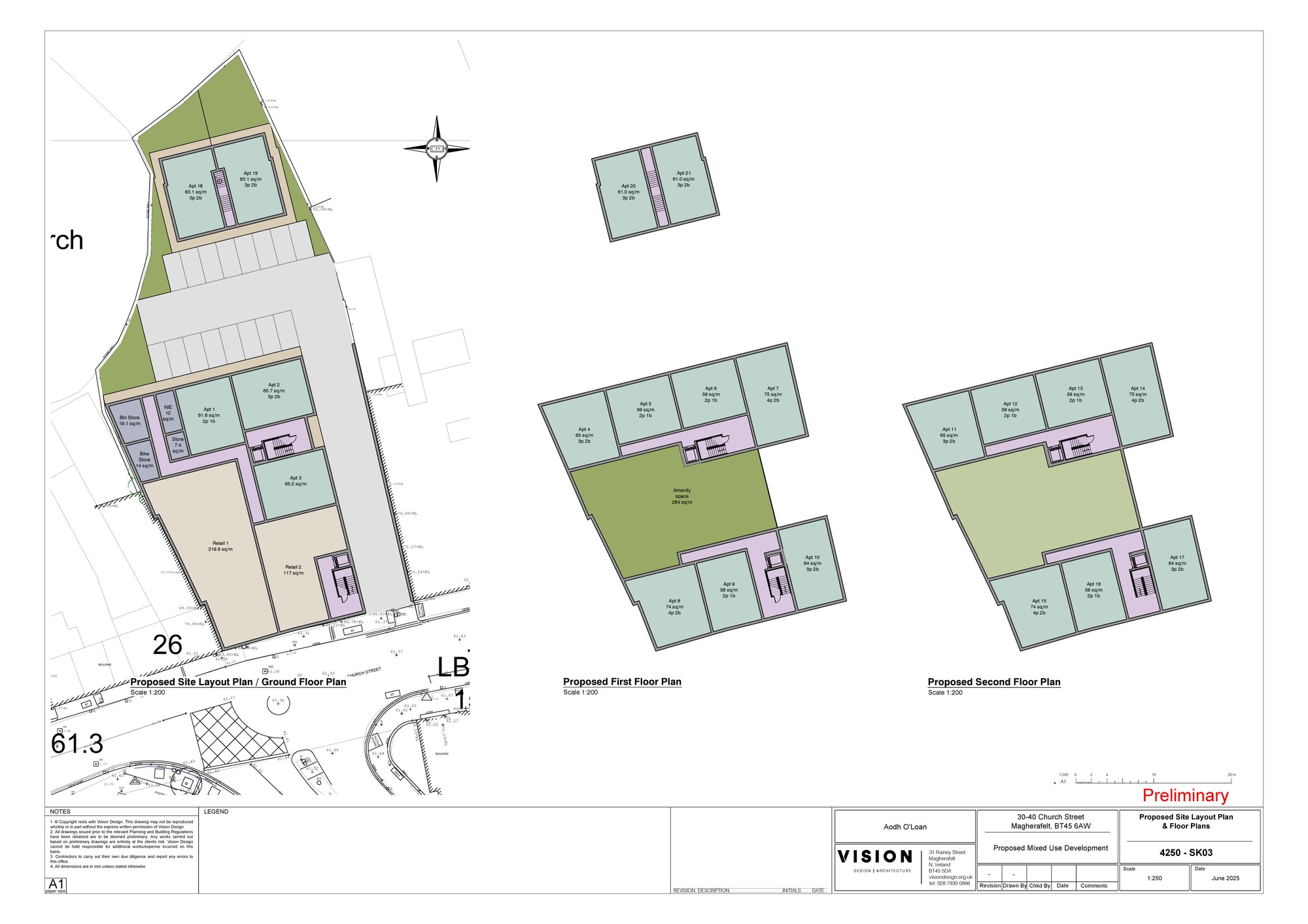 Indicative Scheme layout drawn for 21 No Apartments & Two No Retail Units by Vision Design