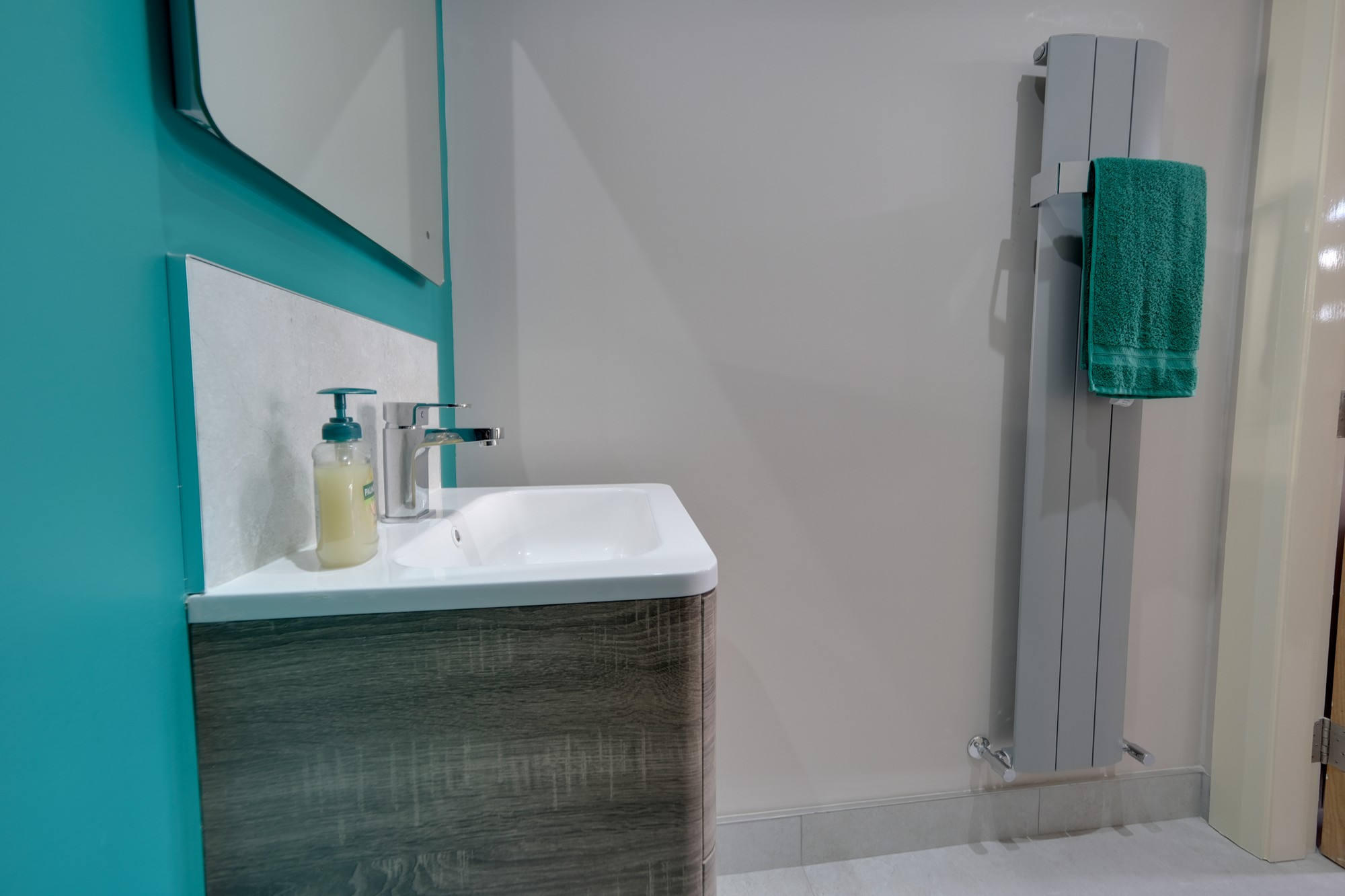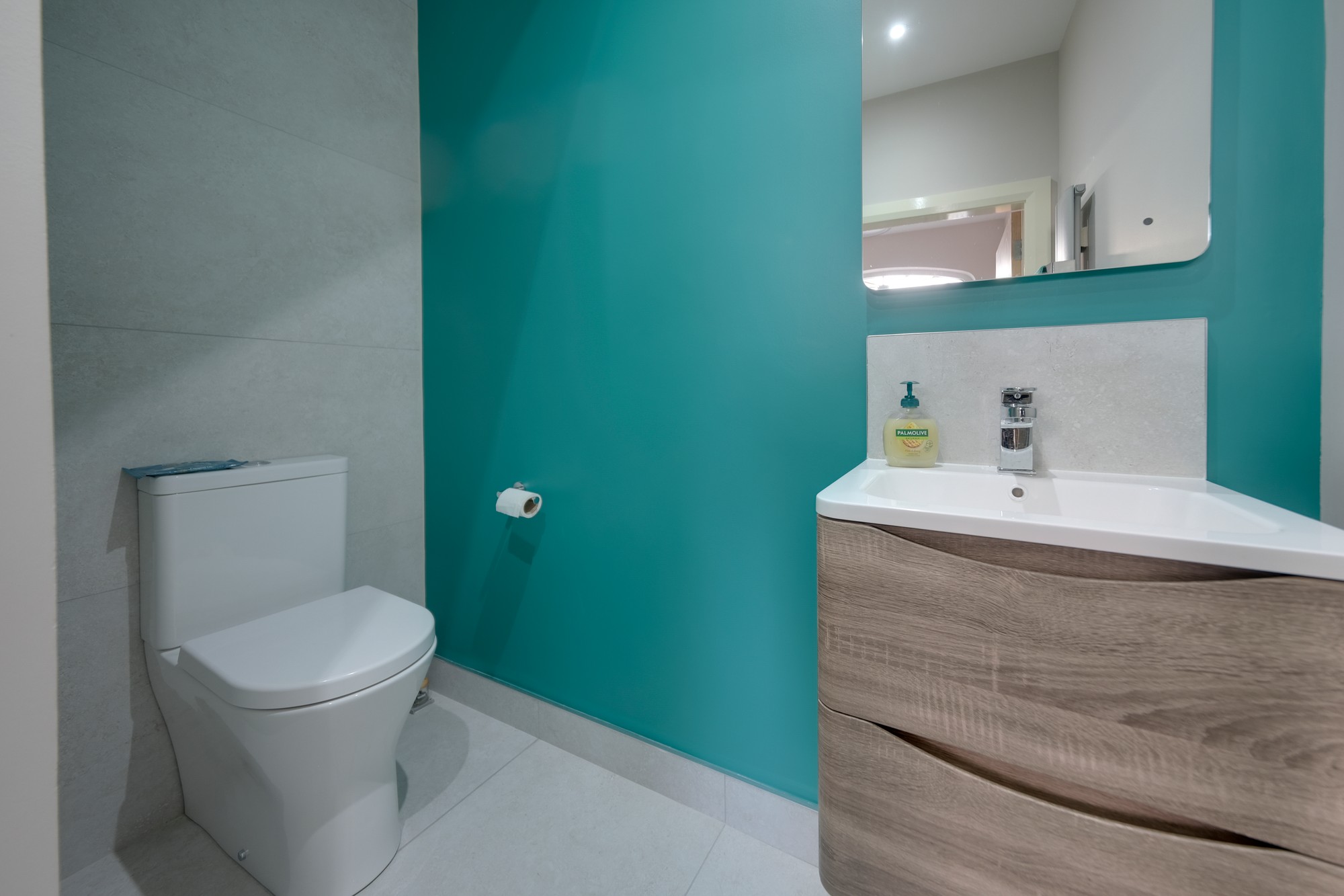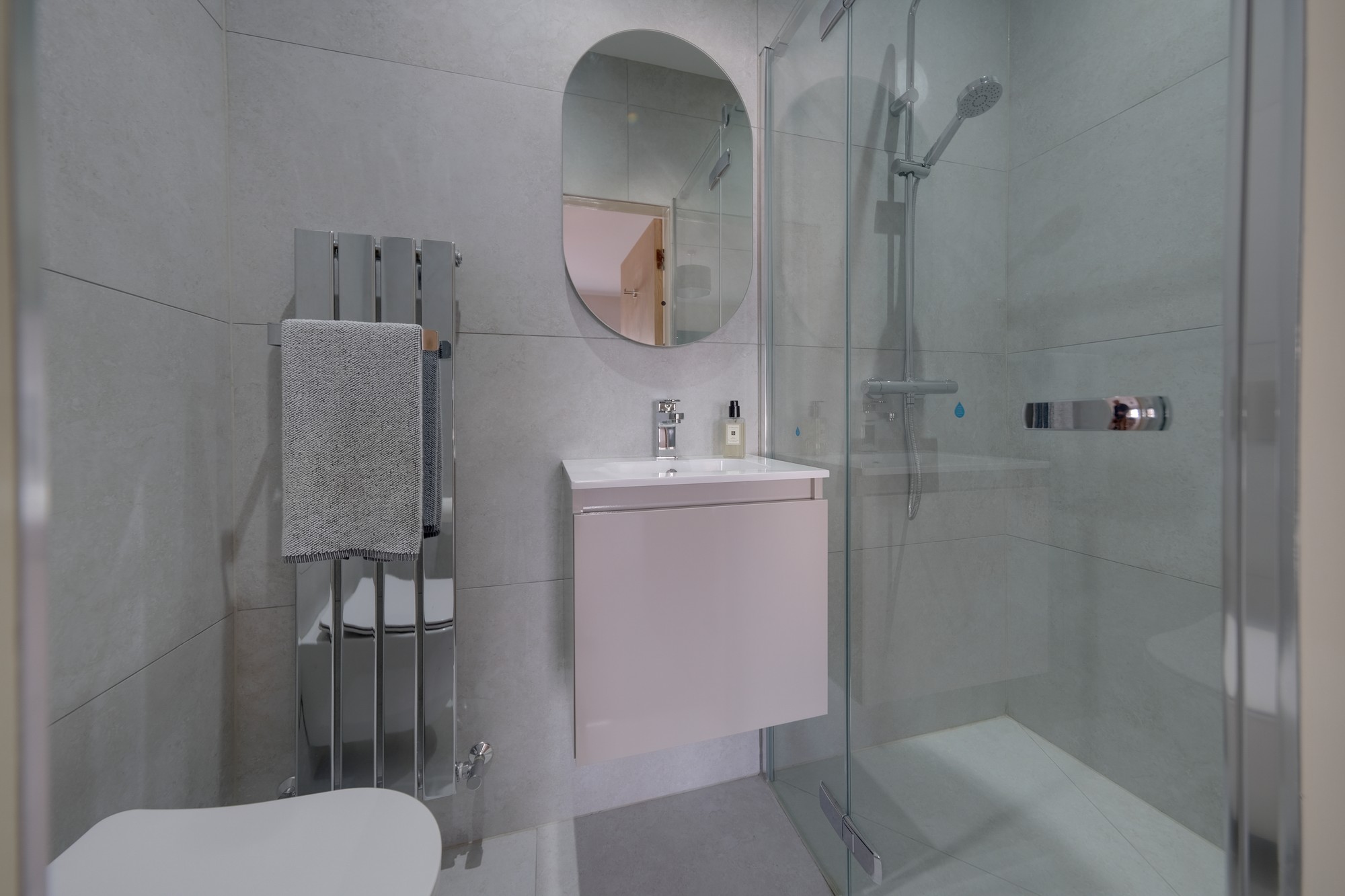 WC: Refurbished with rimless comfort-height toilet, wall-hung sink, LED backlit mirror and vertical radiator.