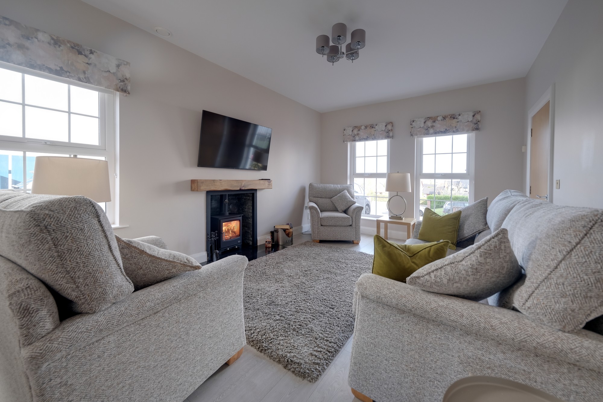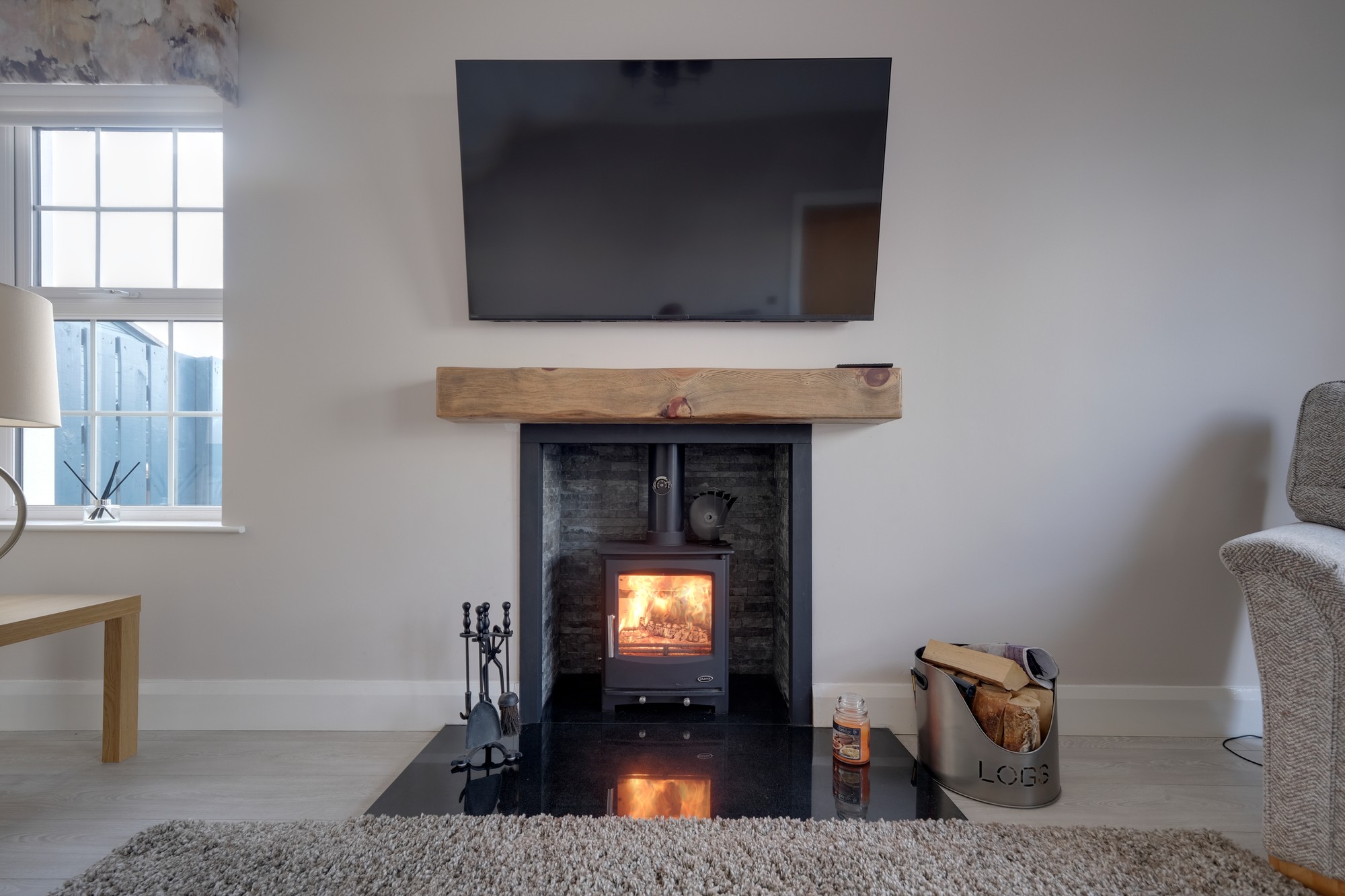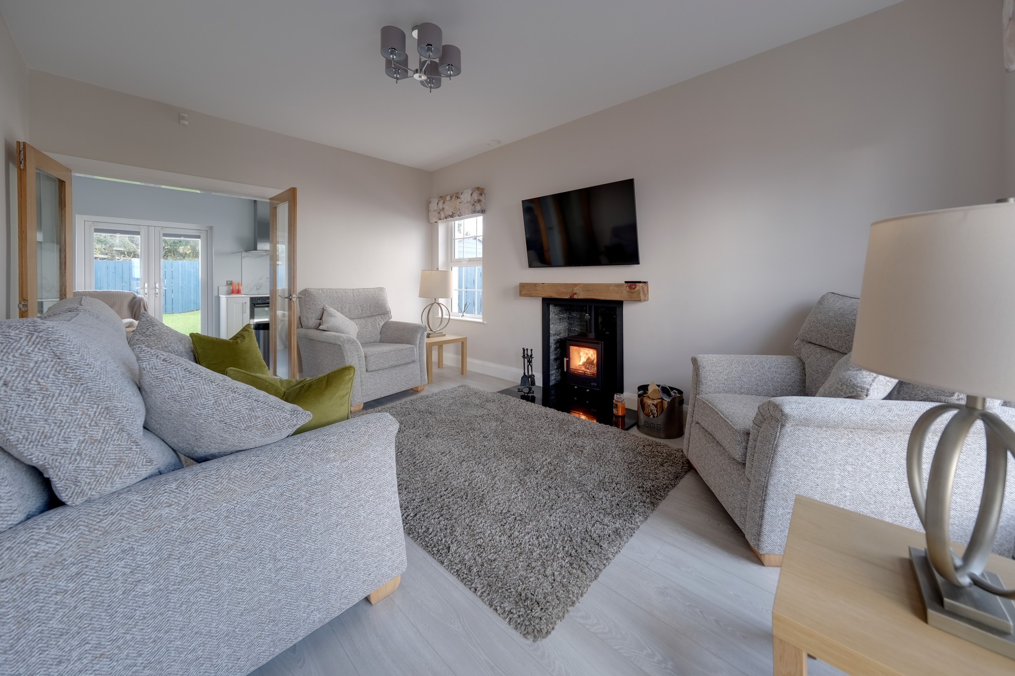 Living room: Laminate flooring, multi-fuel stove (installed April 24), wired for wall-mounted TV, double doors to kitchen.