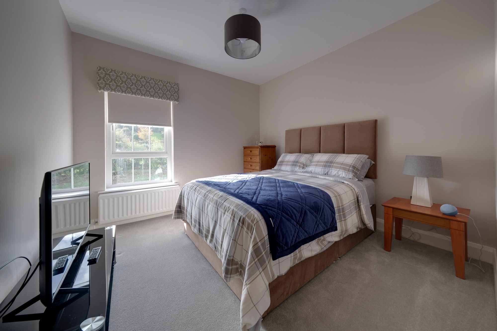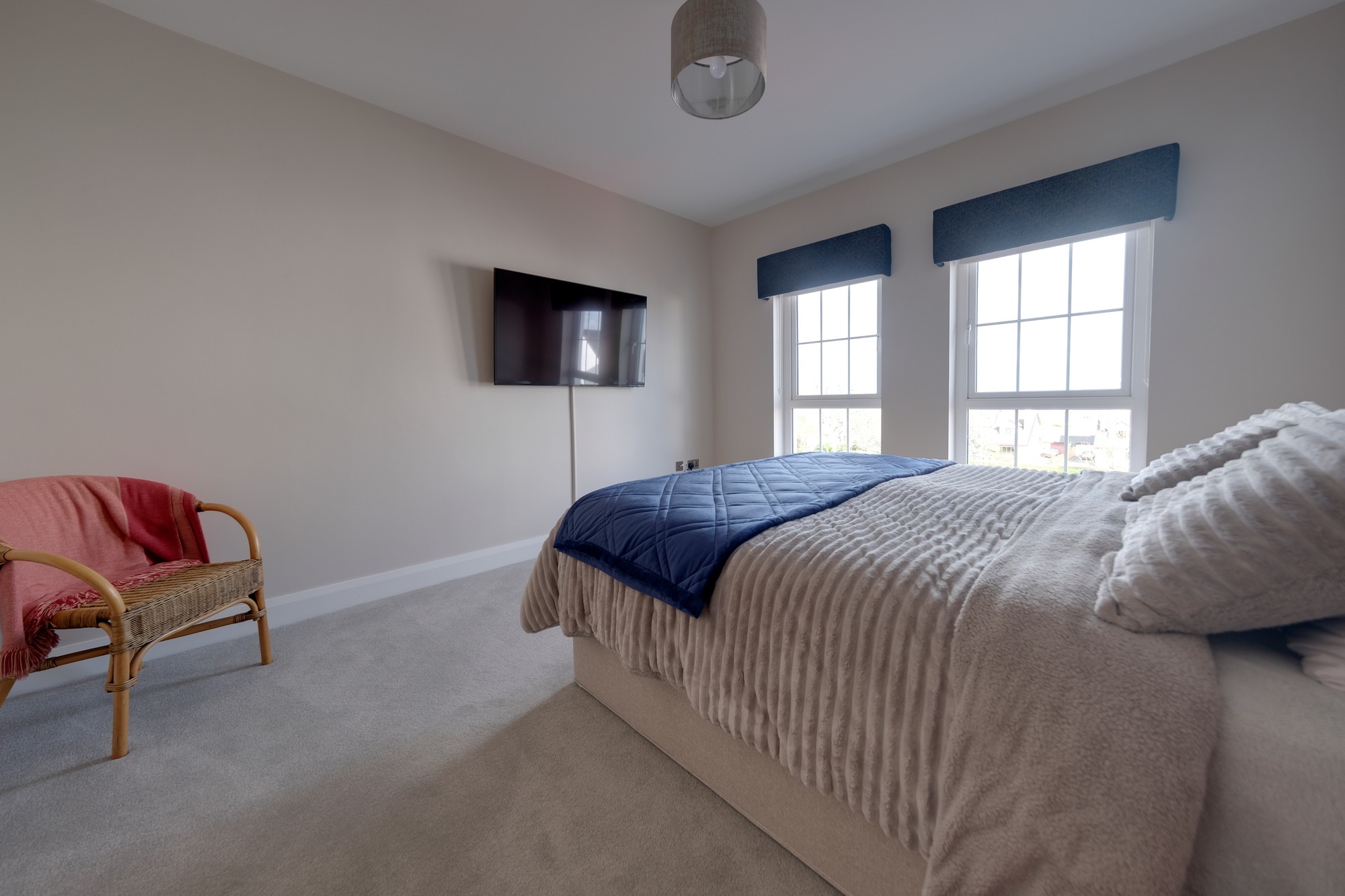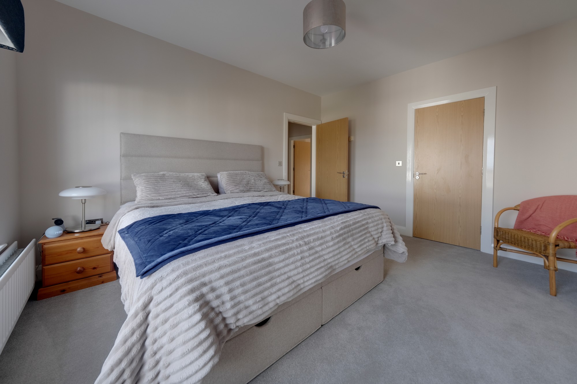 Principal bedroom: Fits super-king bed, neutral carpet, refurbished en-suite with low profile shower, wall hung WC and sink, LED mirror.