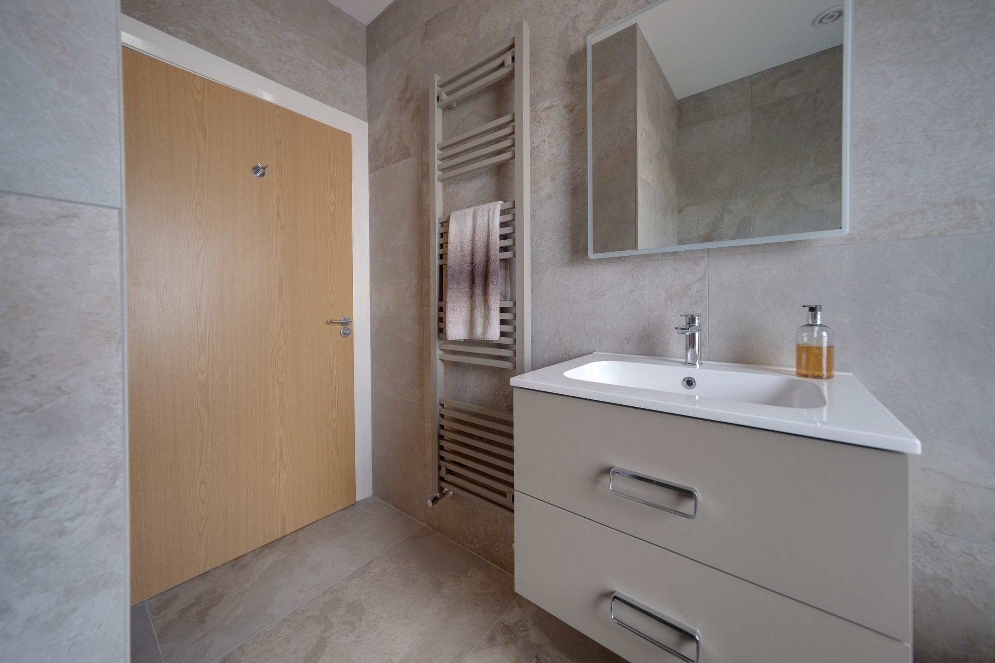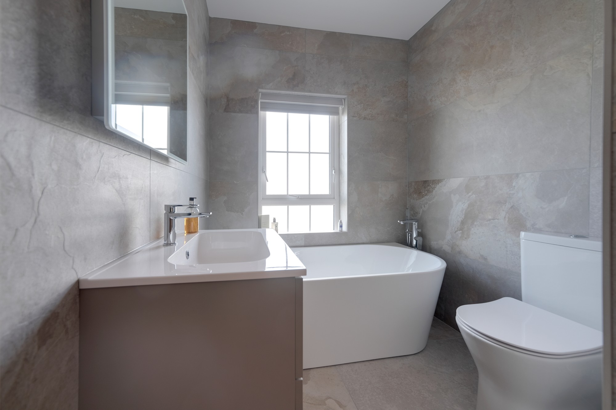 Main bathroom: Refurbished with floor to ceiling tiles, semi freestanding bath with floor mounted tap, rimless comfort height toilet, wall hung sink, LED mirror with shaver/toothbrush port.