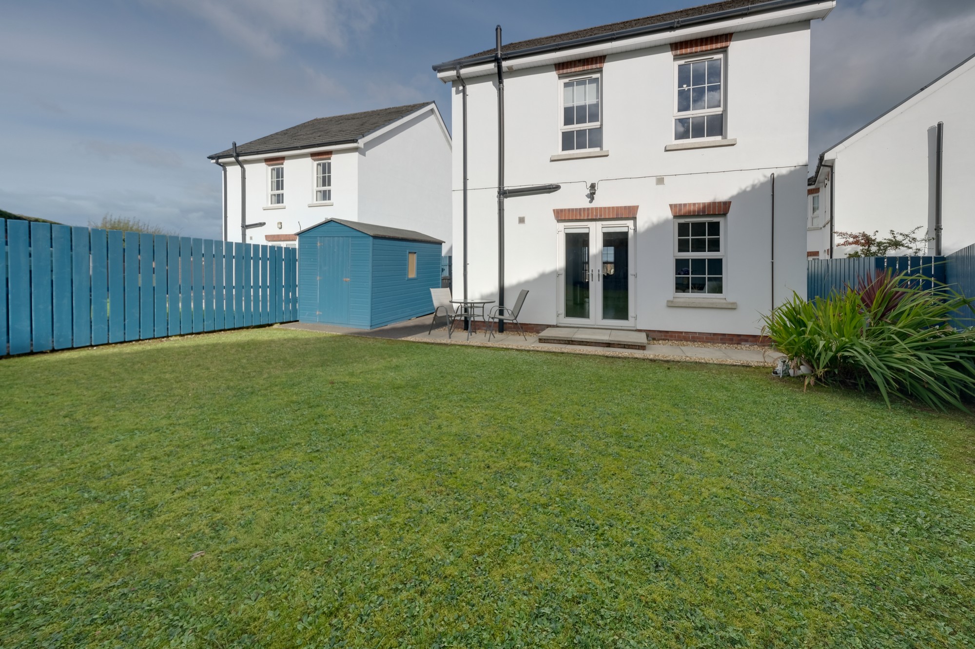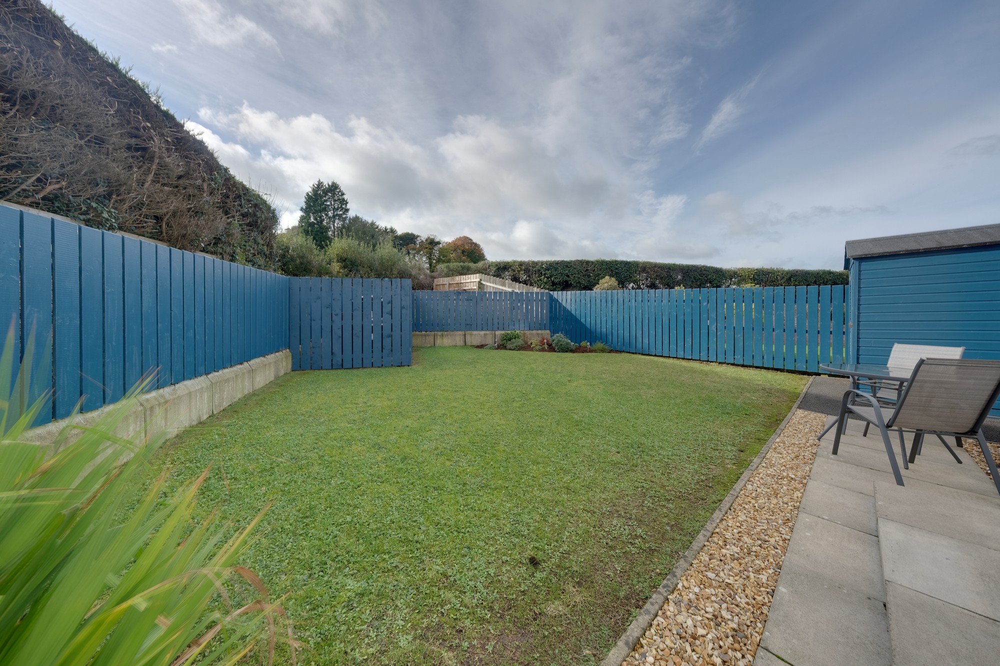 Fully enclosed, low maintenance southeast-facing rear garden with open aspect.