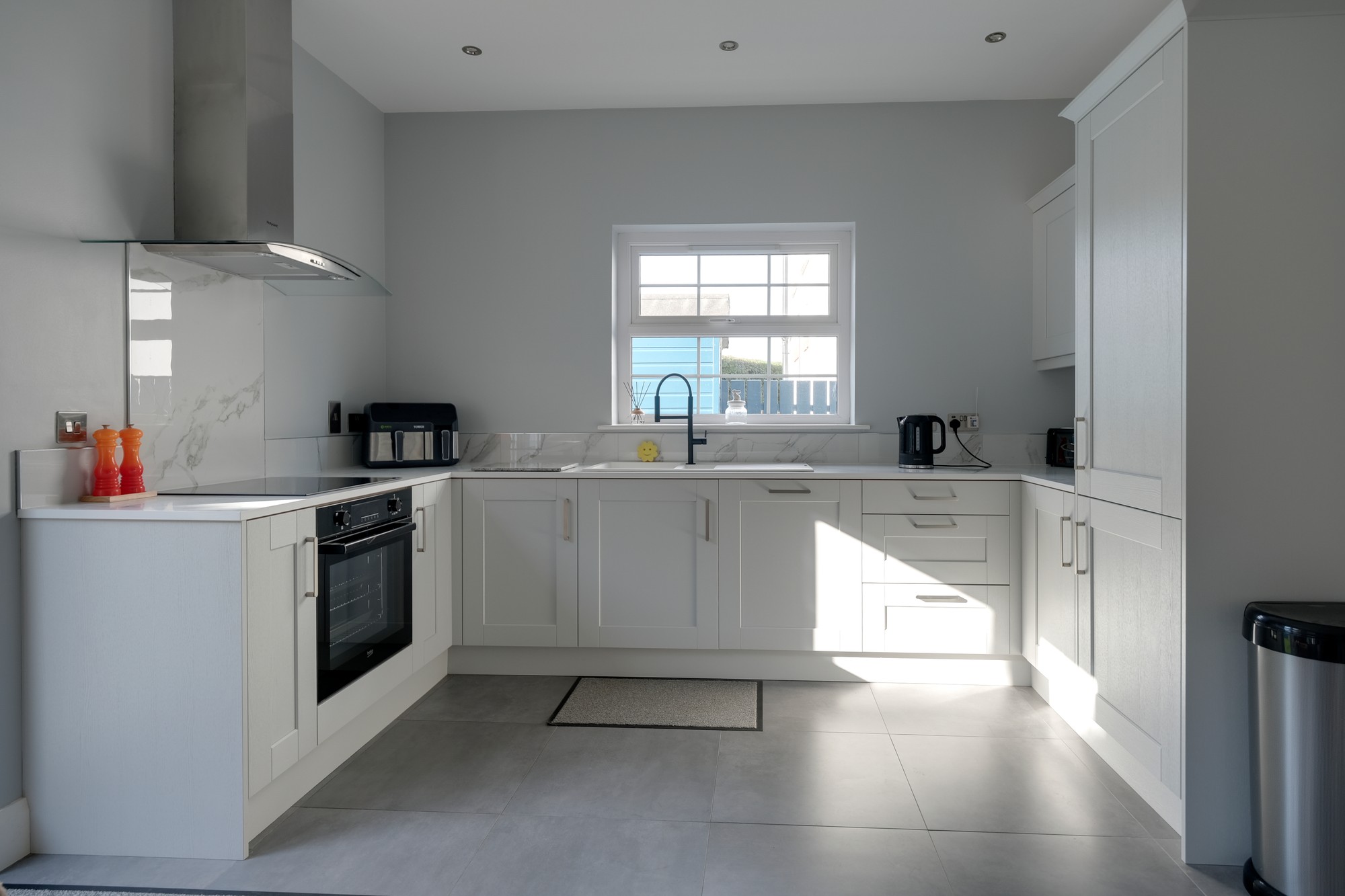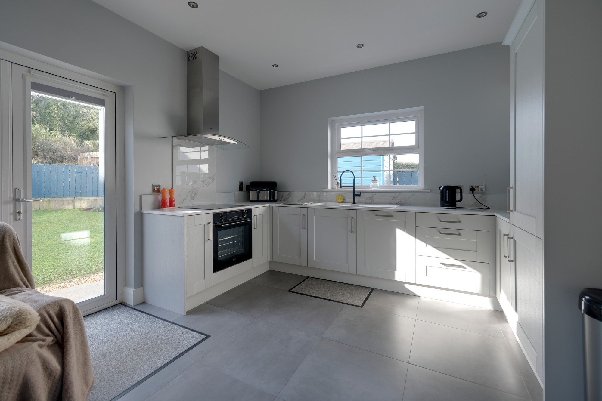 Kitchen/Dining: Shaker style units (installed July 2025), integrated appliances, white granite Caple sink complimented with black Nobili tap, Le Mans corner carousel, LED spotlights, patio doors.