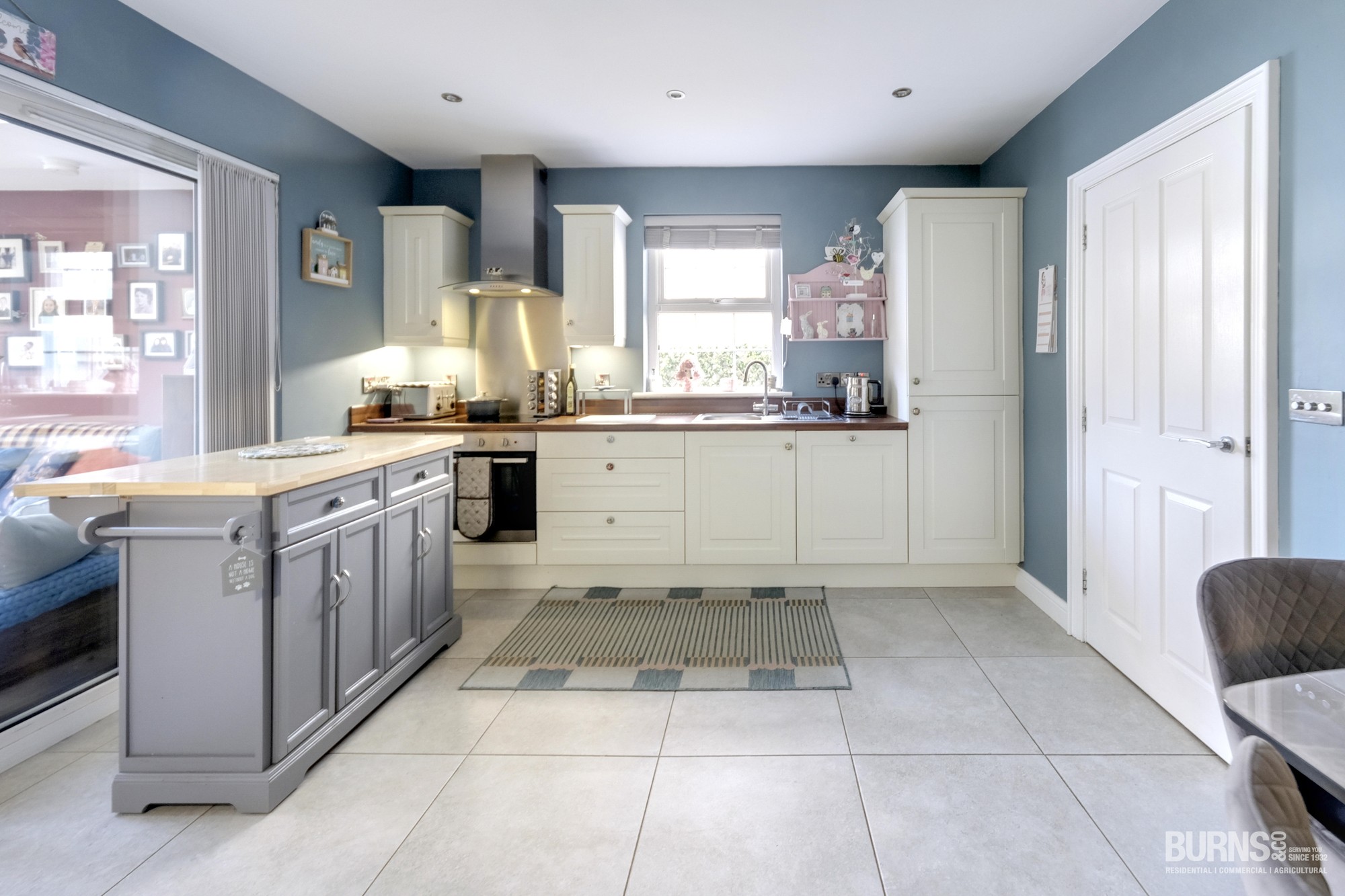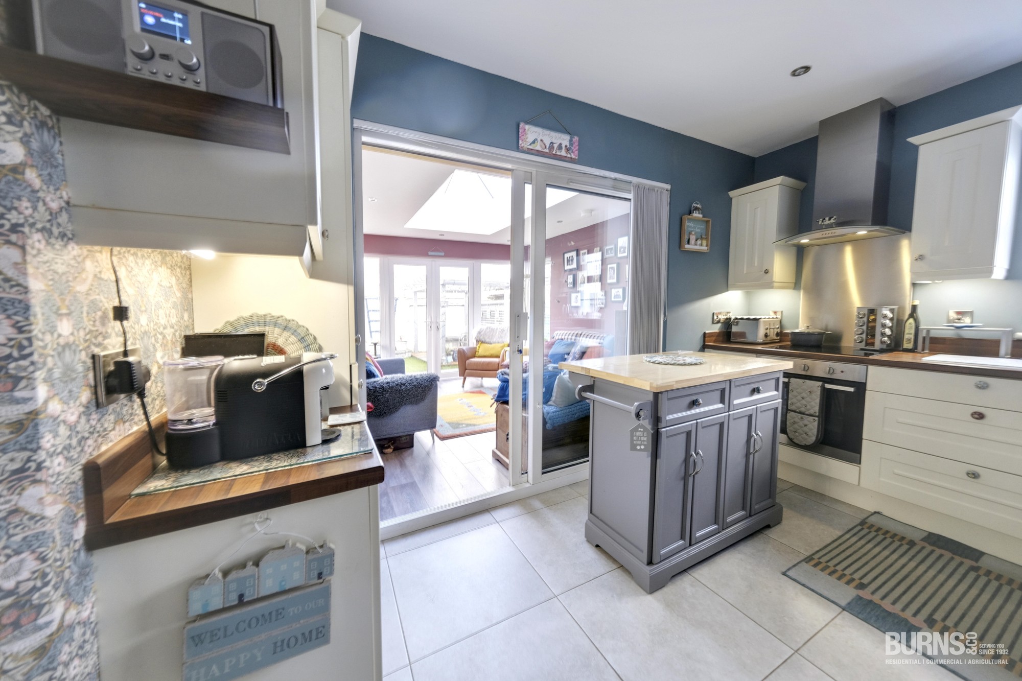 Good range of low and eye level units, tiled floor, sliding door to sunroom.