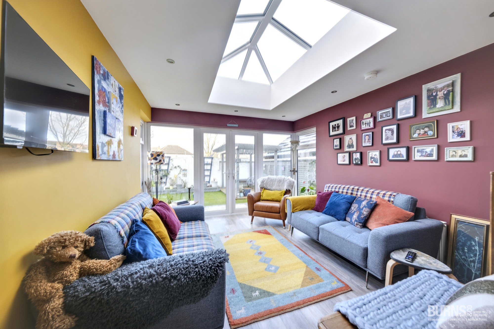 A stunning skylight floods the space with daylight, creating a bright, uplifting atmosphere while helping to capture and retain warmth.