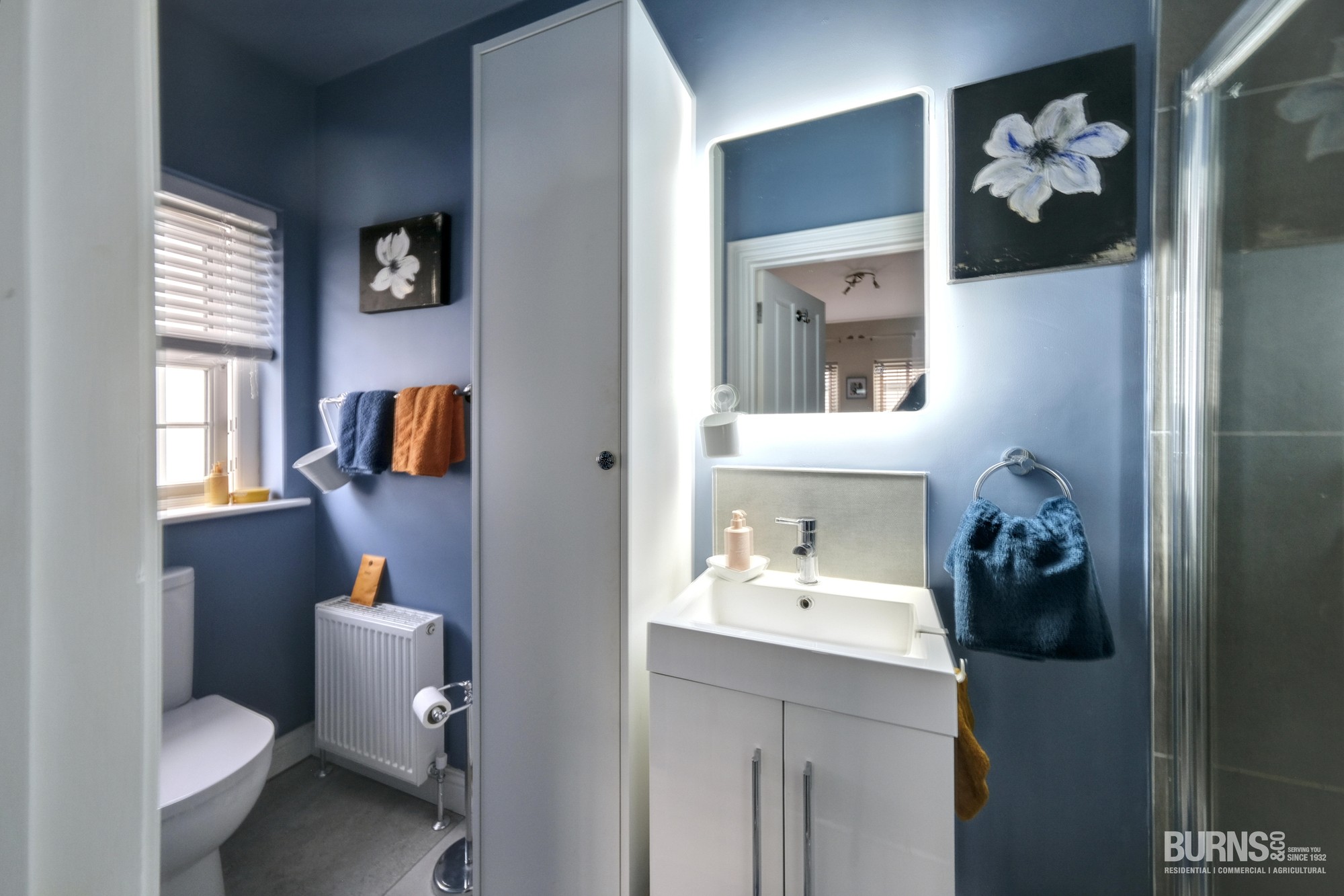 W.C, W.H.B., with vanity unit, tiled floor.