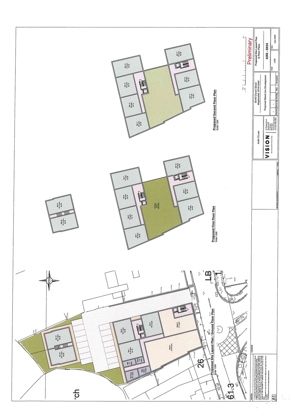 Indicative Scheme layout drawn for 21 No Apartments & two No. Retail Units by Vision Design.