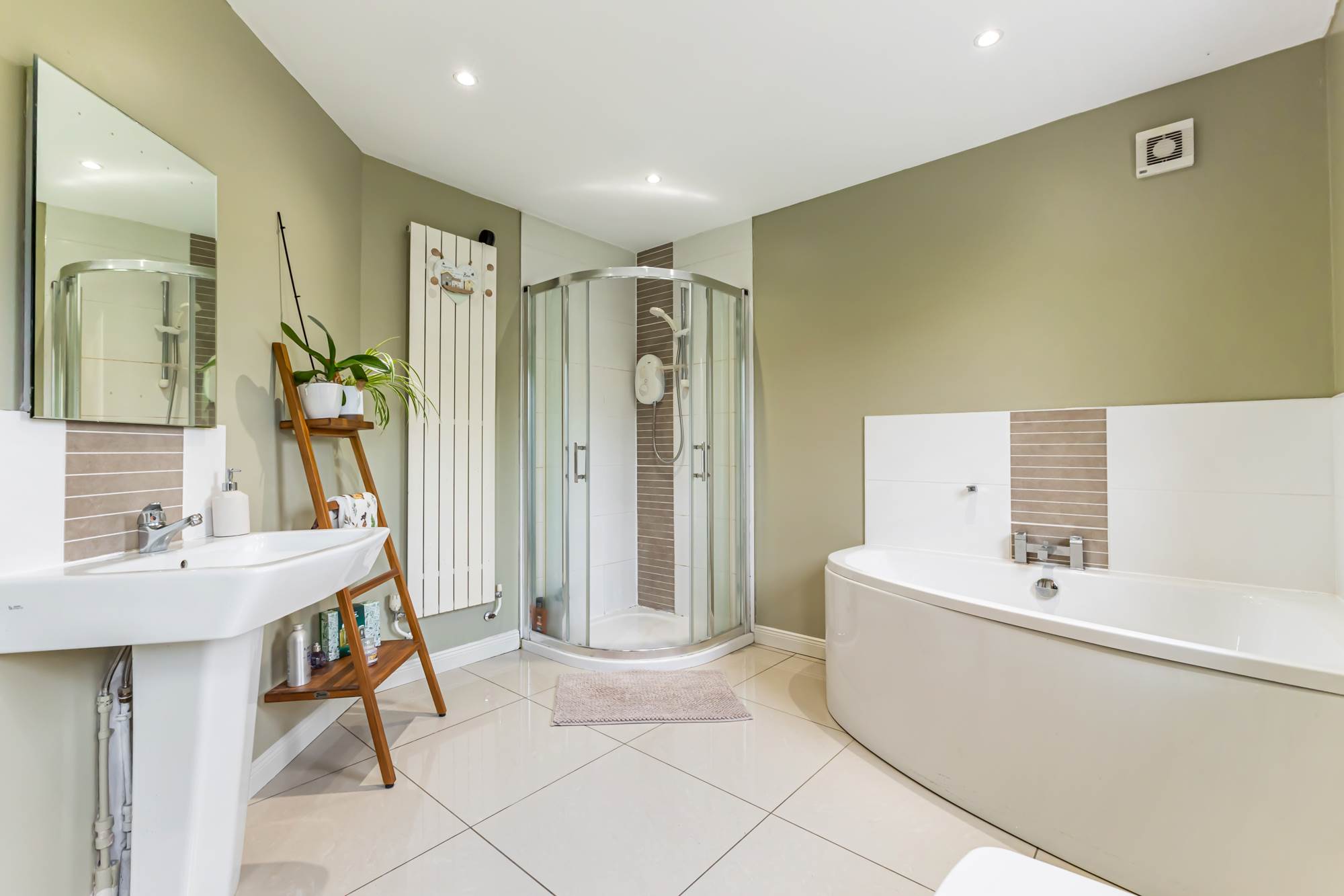 Comprising corner bath, low flush wc, pedestal wash hand basin, corner shower cubicle, ceramic tiled floor, spotlights.