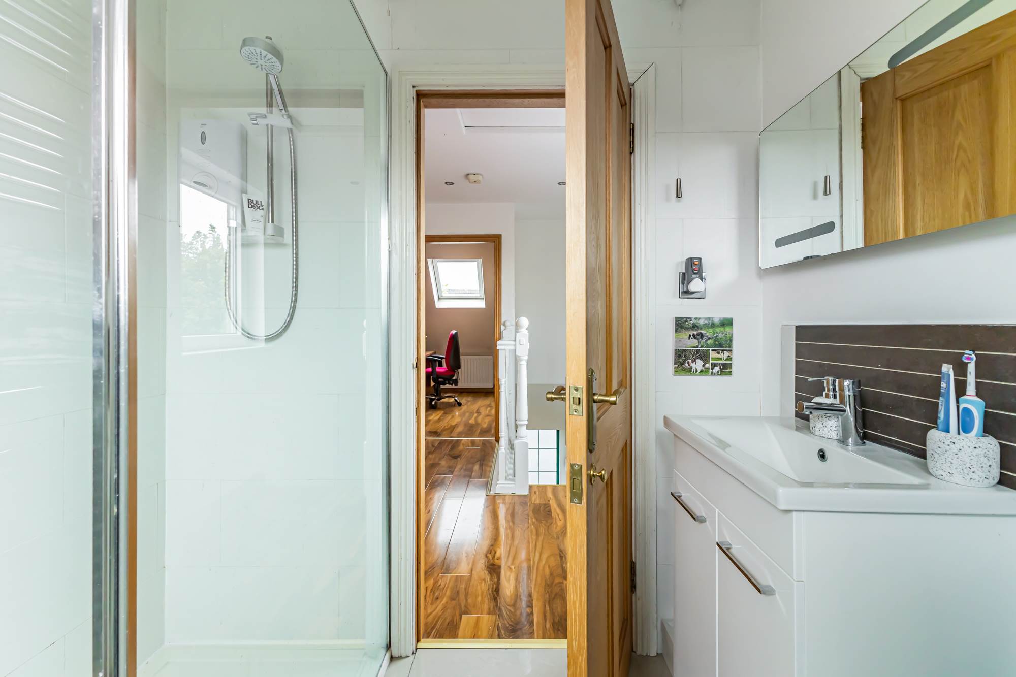 Shower cubicle with Mira Sport electric shower unit, chrome heated towel rail.