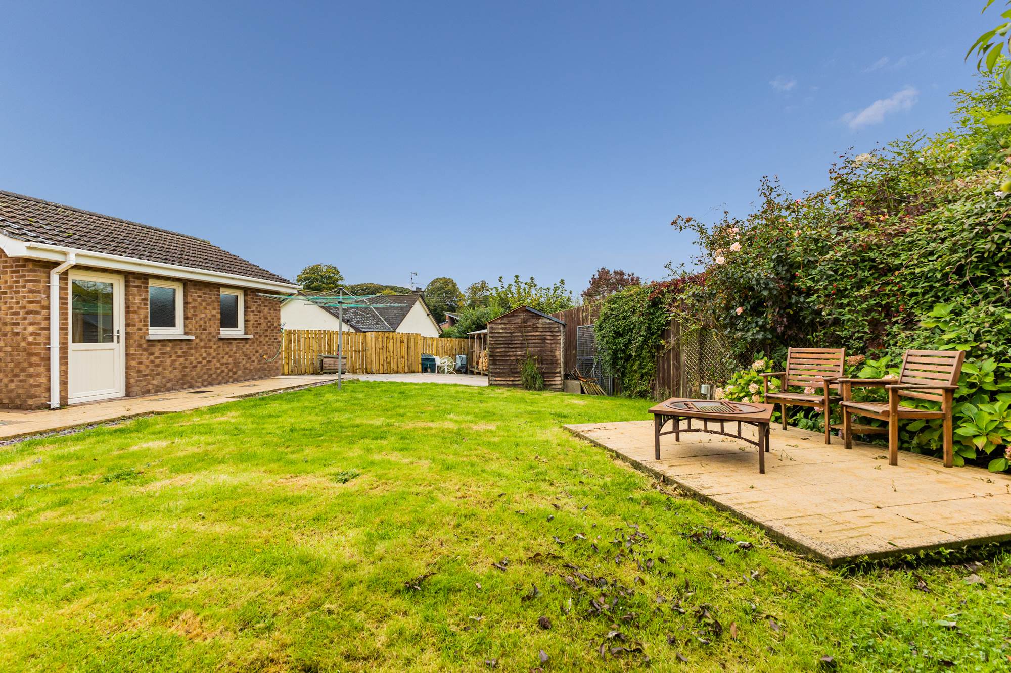 Front garden in lawn. Rear garden in lawn, large patio areas, oil tank, shed.