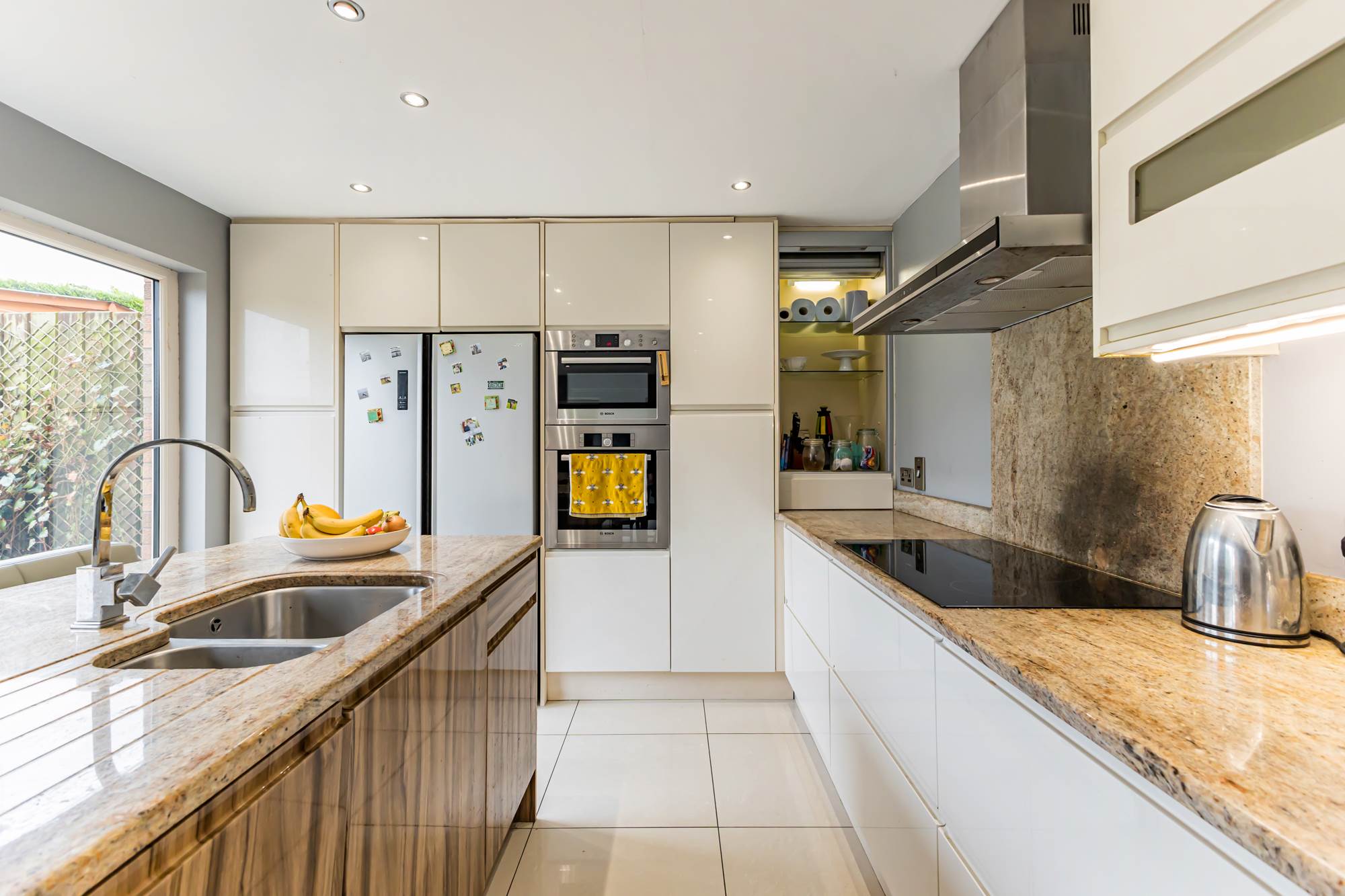 Range of high and low level units, 1.5 bowl stainless steel sink unit with mixer tap, Bosch four ring hob and stainless steel extractor fan, oven and microwave, integrated dishwasher, housing for American fridge freezer, island unit.