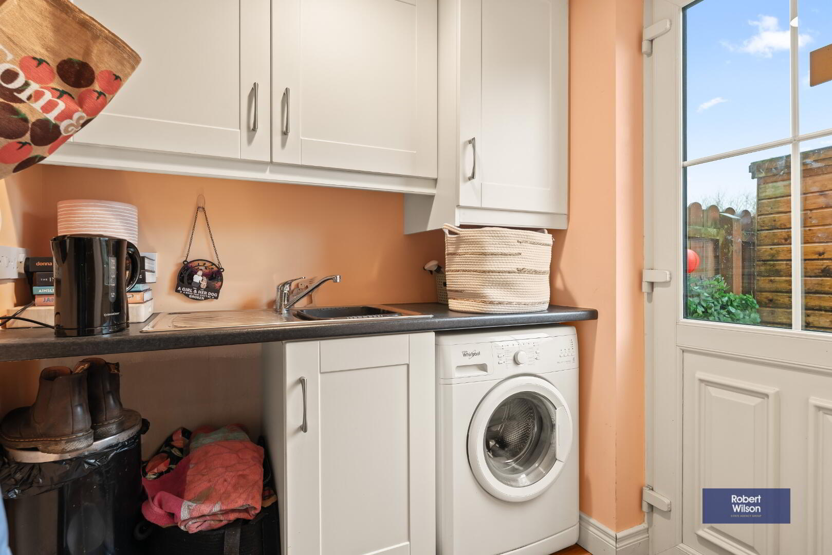 1.8m x 1.6m (5' 11" x 5' 3") High and low level units to match kitchen, space for washing machine and tumble dryer, stainless steel sink unit, wooden laminate flooring.