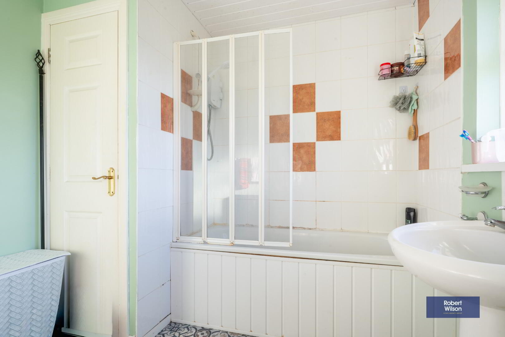 White suite comprising; low flush w.c., pedestal wash hand basin, walk in shower cubicle with electric shower, single panel radiator, extractor fan, tiled floor, part tiled walls.