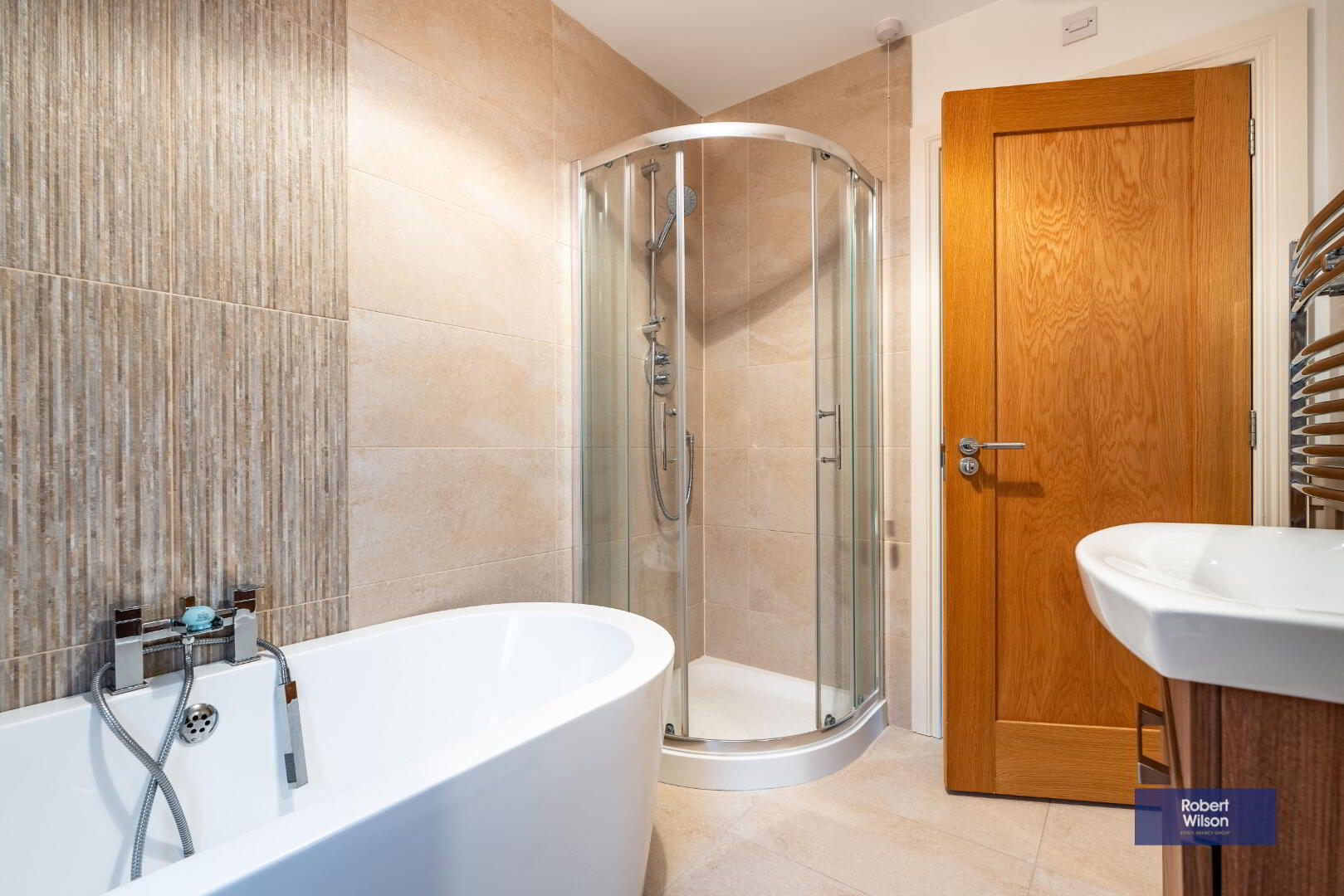 Upstairs, the property boasts four well-proportioned bedrooms, including a spacious main bedroom with feature panelled wall and modern en-suite. The family bathroom is finished to a high standard with a freestanding bath and walk-in shower, creating a luxurious retreat.