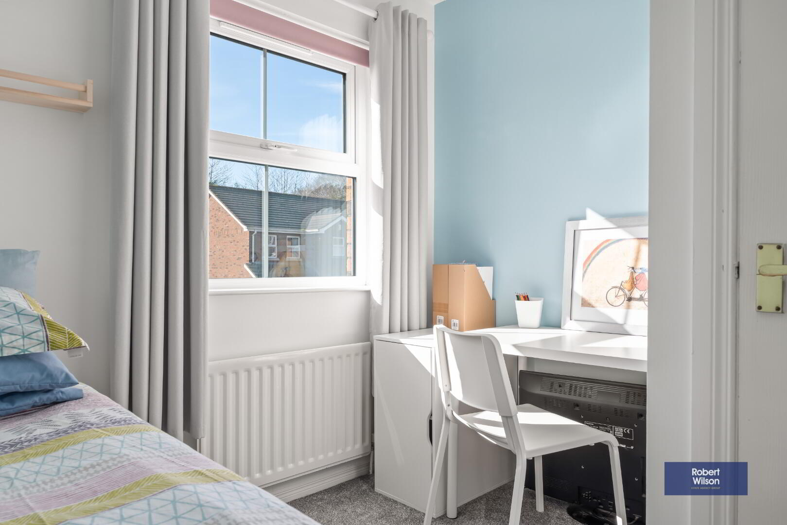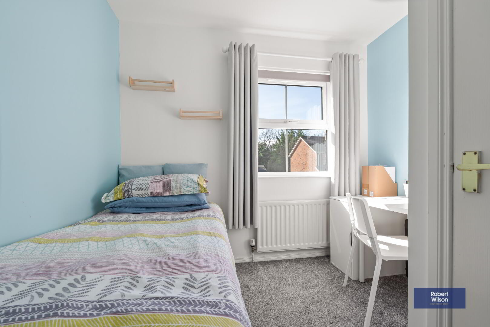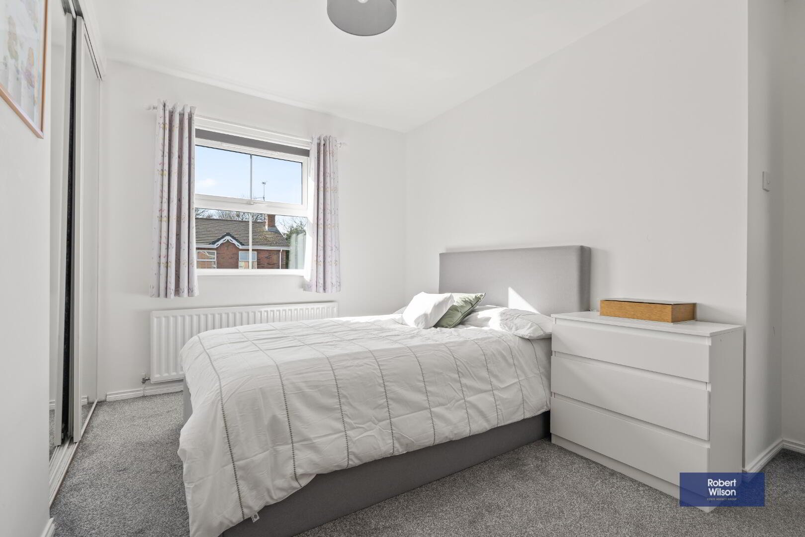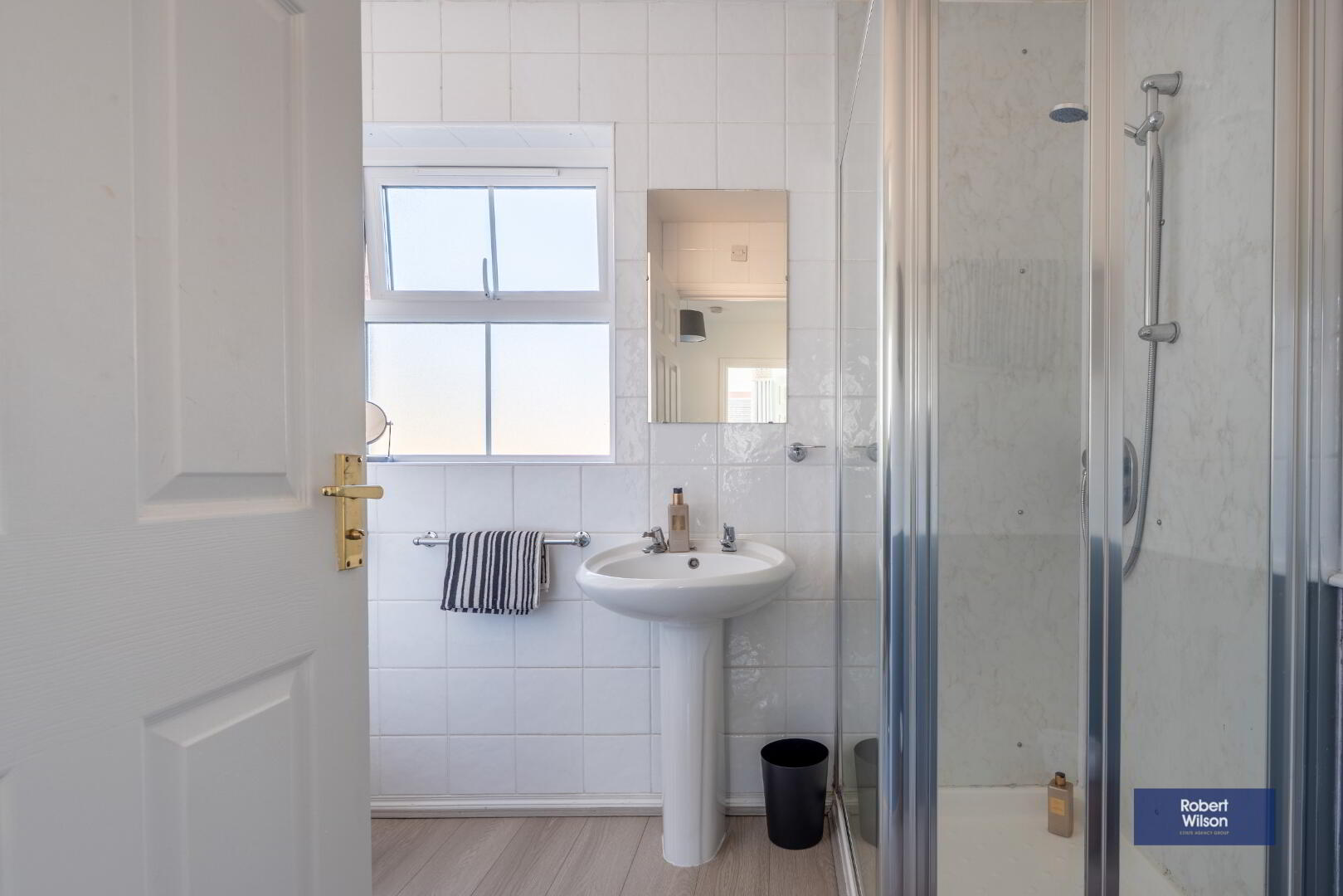 Upstairs, the property offers three well-proportioned bedrooms, including a spacious main bedroom and built-in storage in bedroom three. The modern shower room is fitted with a white suite comprising low flush WC, pedestal wash hand basin and walk-in shower with thermostatic valve, complemented by tiled walls.
