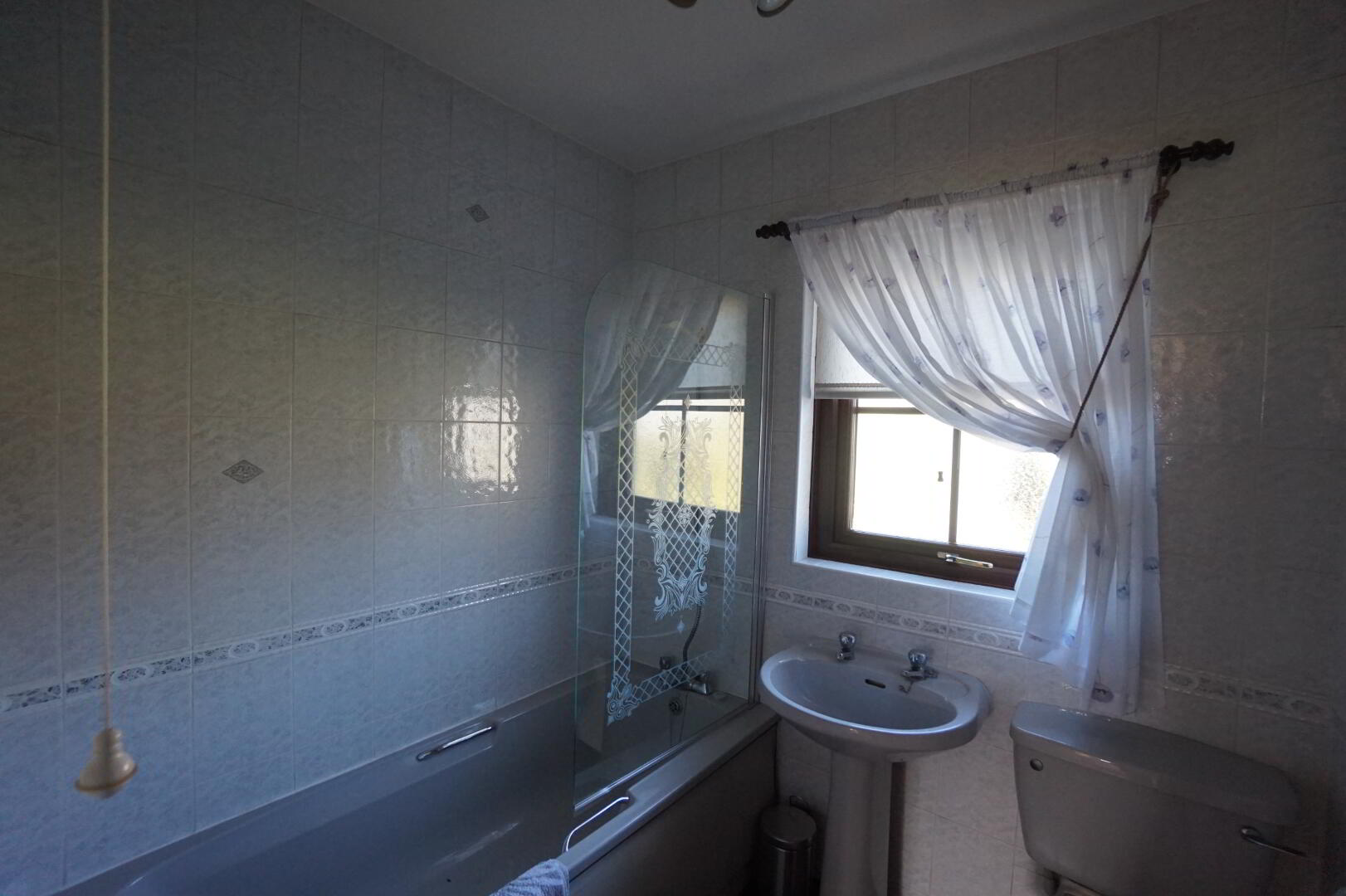 Suite comprising; low flush w.c., pedestal wash hand basin, panel bathtub, single panel radiator, fully tiled walls, tiled floor.