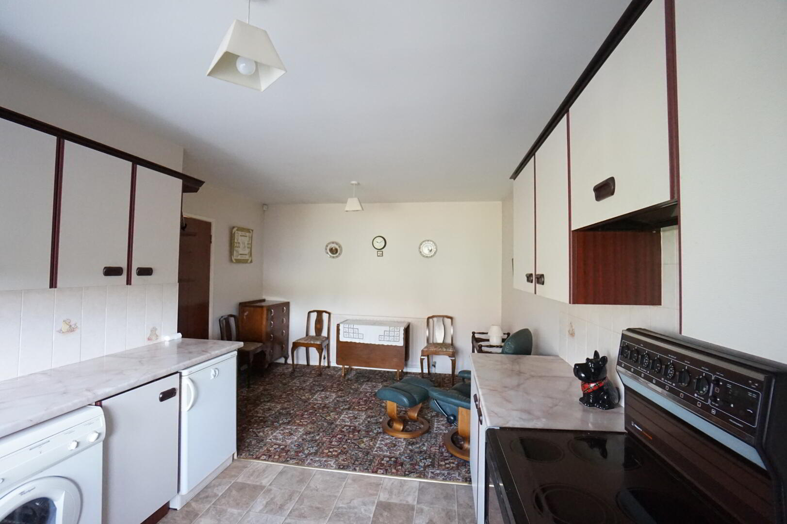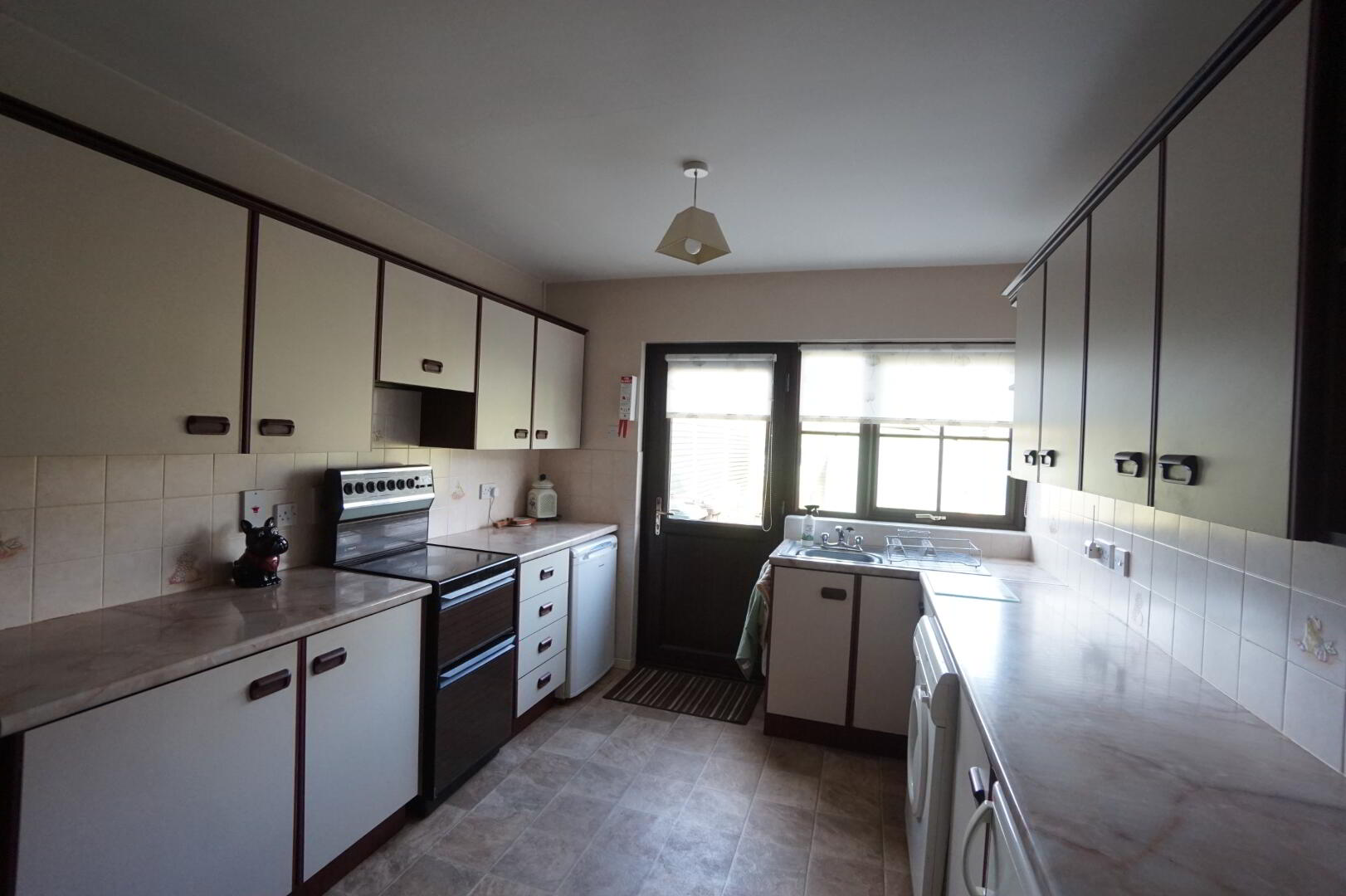 5.53m(max) x 3.58m (18' 2" x 11' 9") Good range of high and low units, laminate worktop, stainless steel sink unit, space for fridge, space for freezer, space for washing machine, double oven with hob and extractor over, rear door with glazed panel, single panel radiator, part tiled walls, tiled floor.