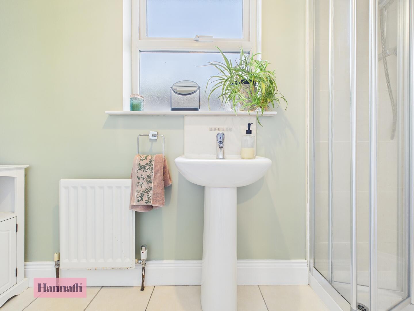 Three piece suite, shower cubicle, wash hand basin, w.c. tiled flooring, radiator