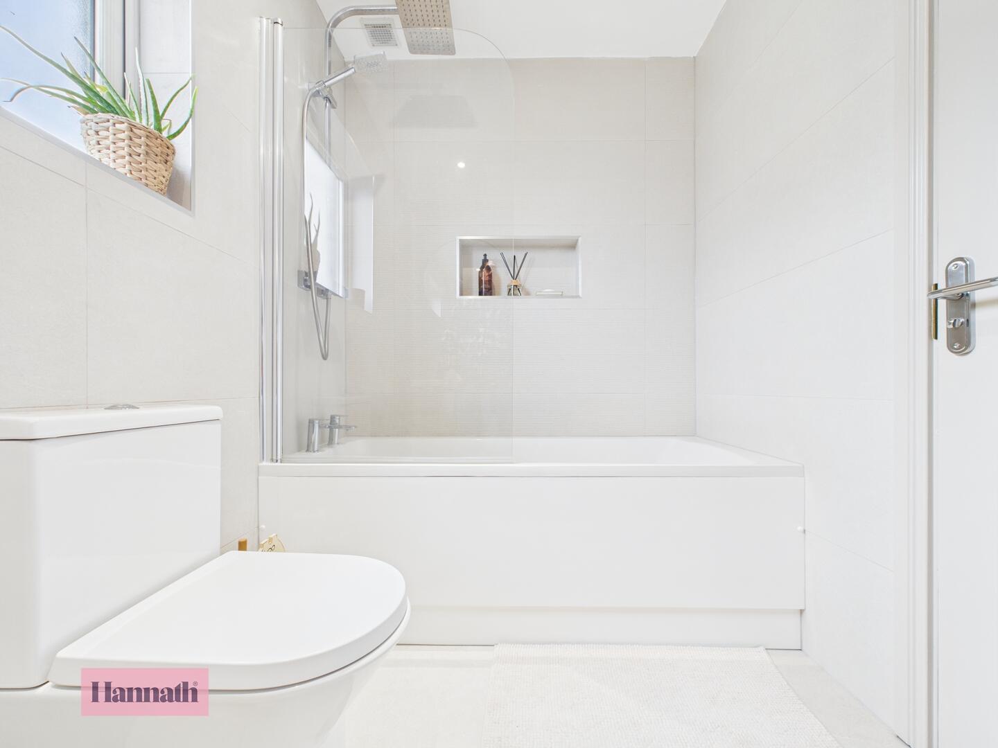 Three piece suite, shower over bath, wash hand basin, w.c., tiled flooring, tiled walls, heated towel rail,