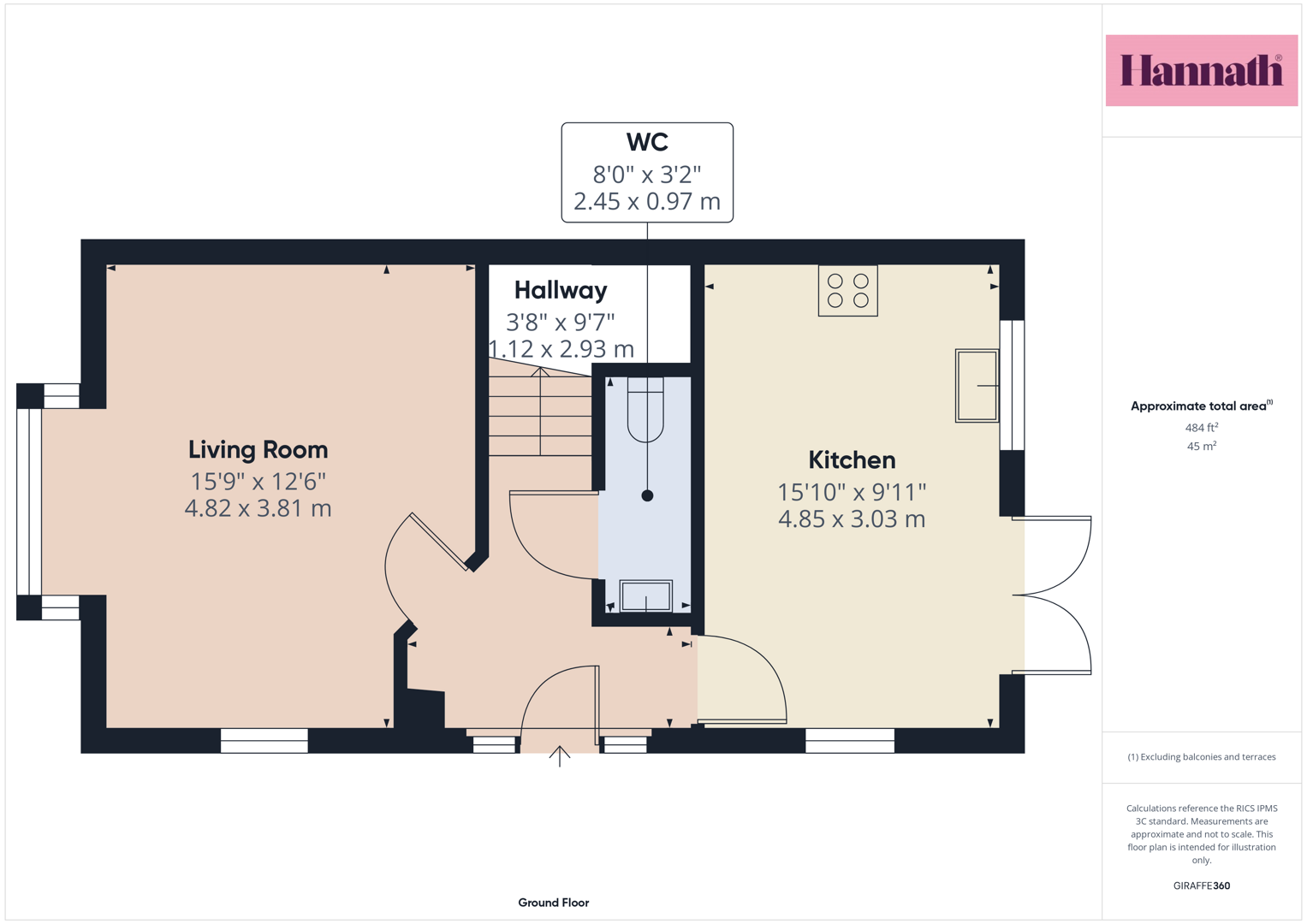 Downstairs W.C. 8'0 X 3'2 (2.44m X 0.97m)