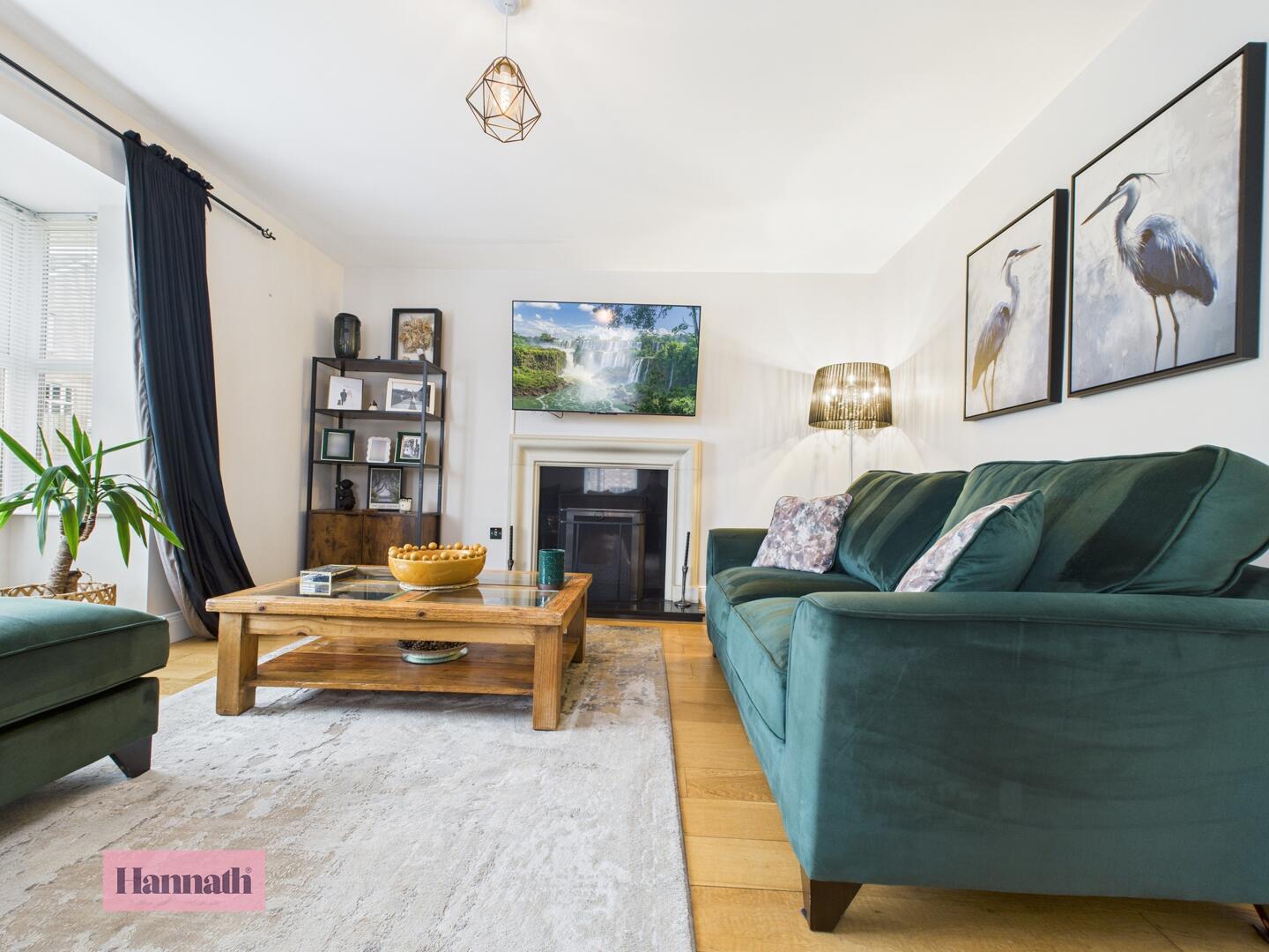 Spacious living room with open fire