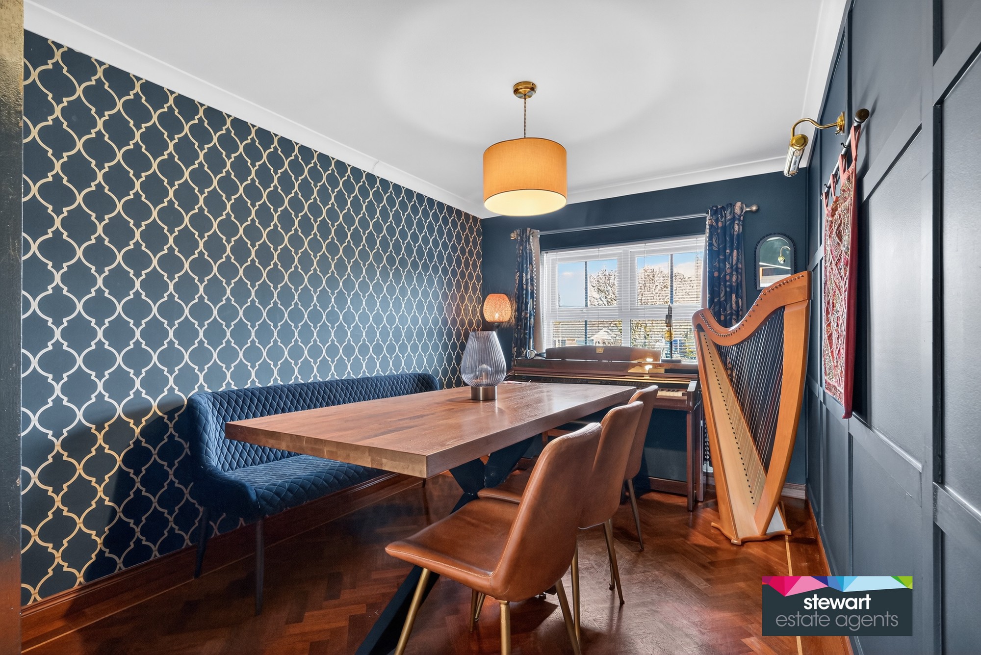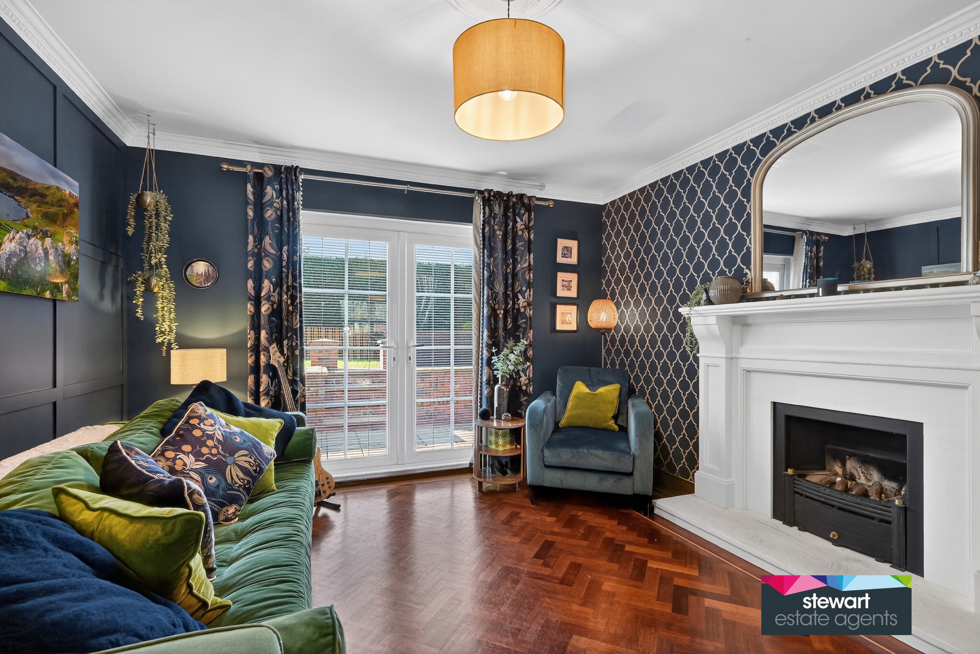 Elegant open plan living room with a raised dining room, having a beautiful solid wooden floor through to the dining. Stunning feature fireplace with an inset and hearth