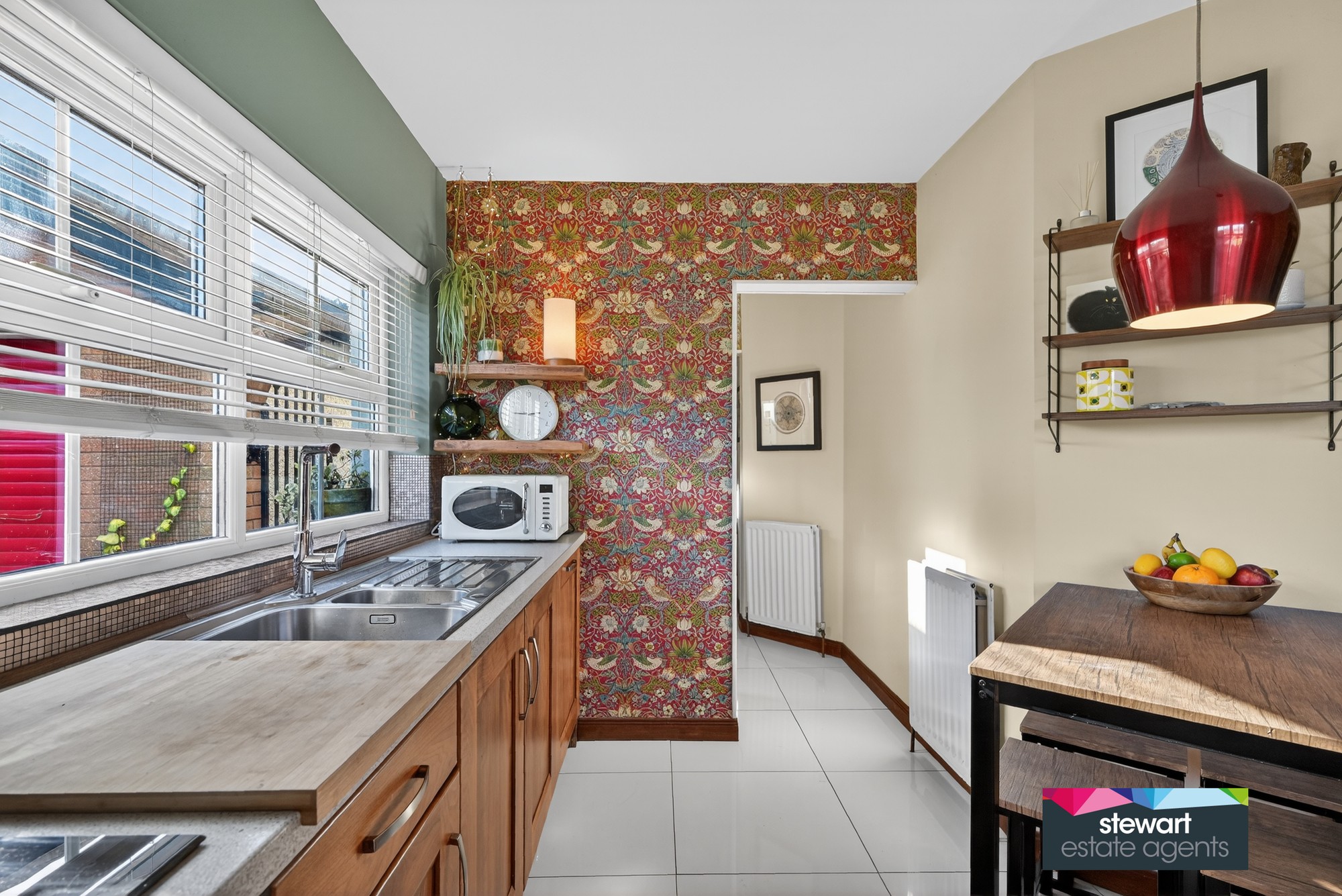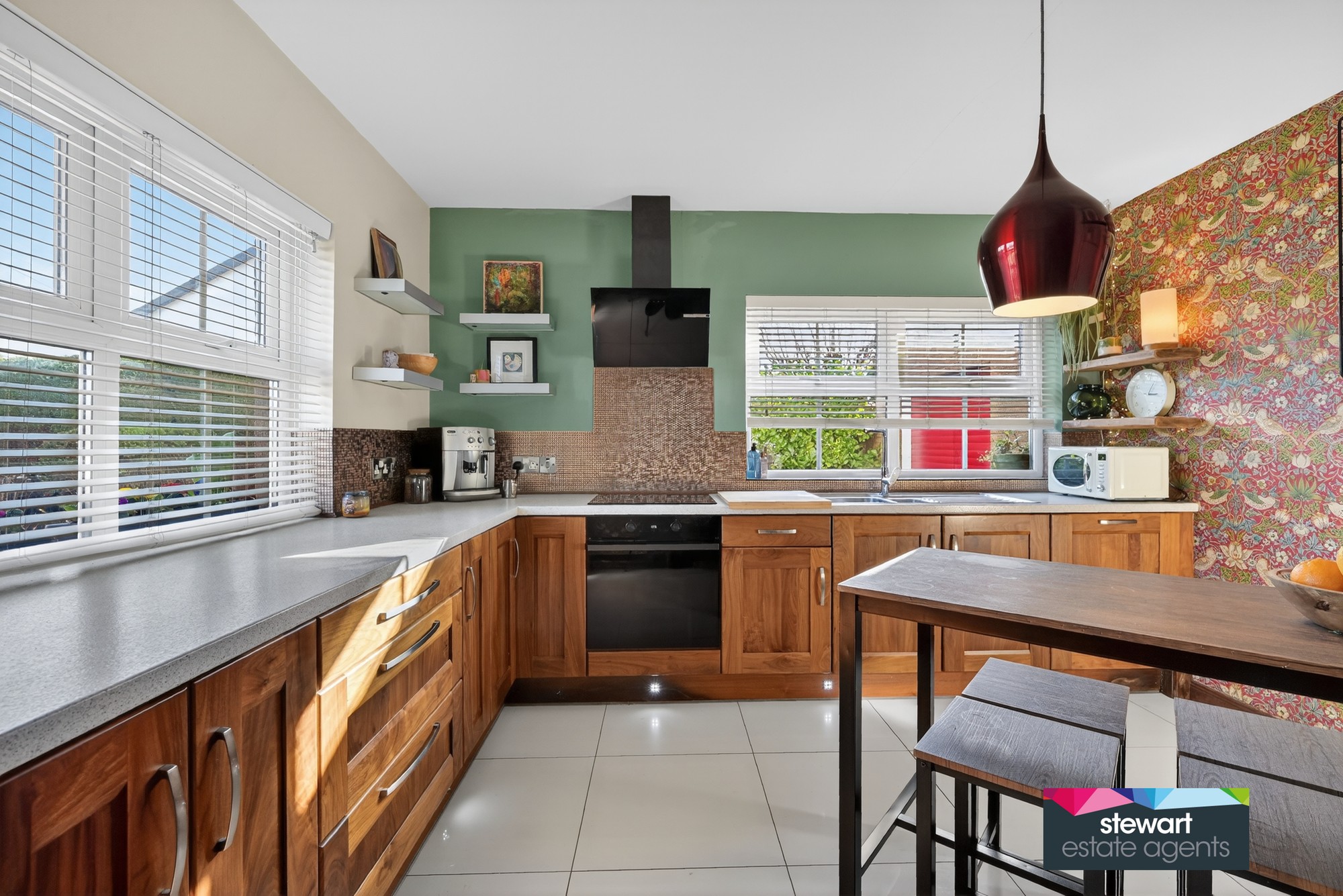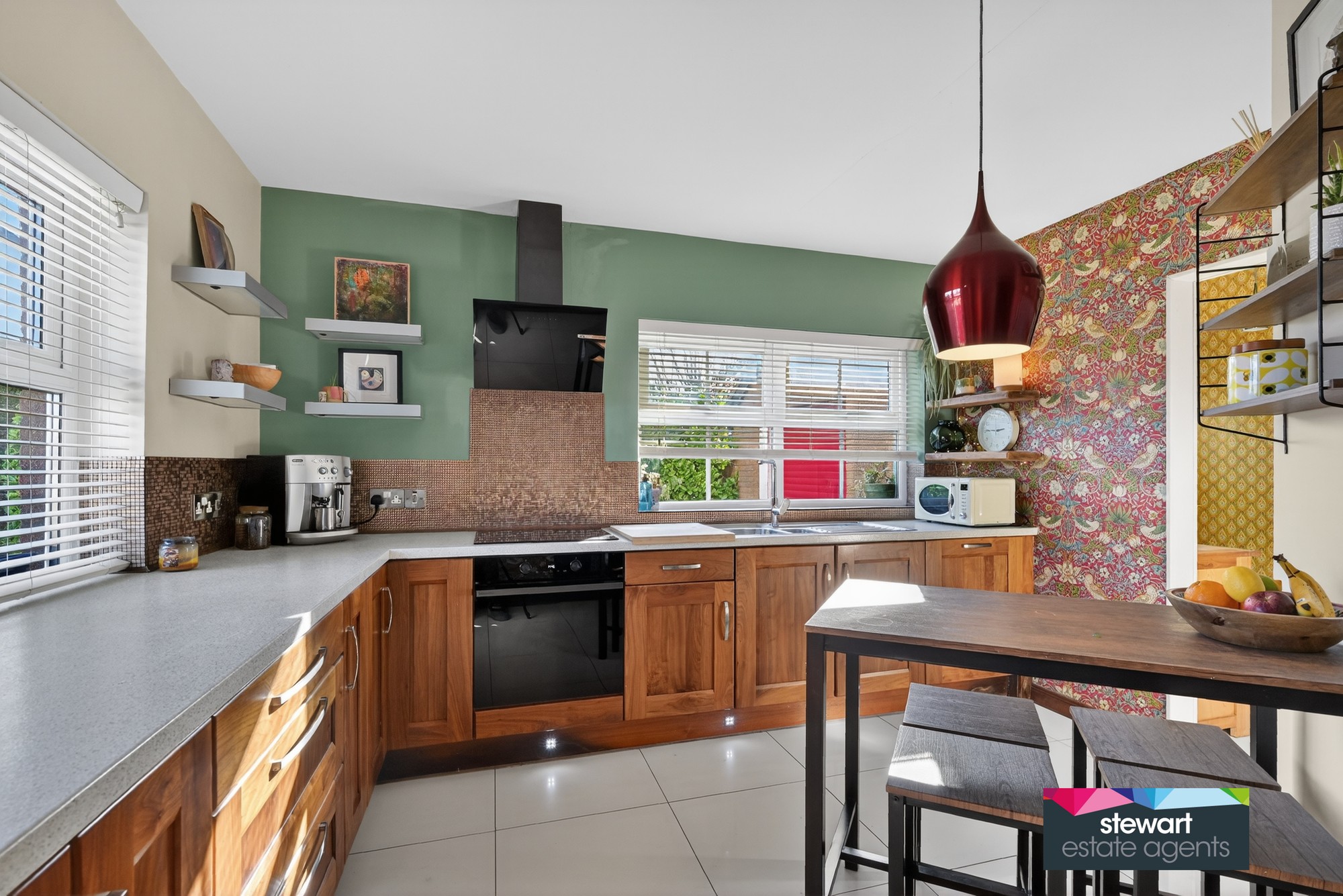 A beautifully fitted kitchen with a good range of storage cabinets including a modern style oven and inset hob with extractor fan above. Built in dishwasher.