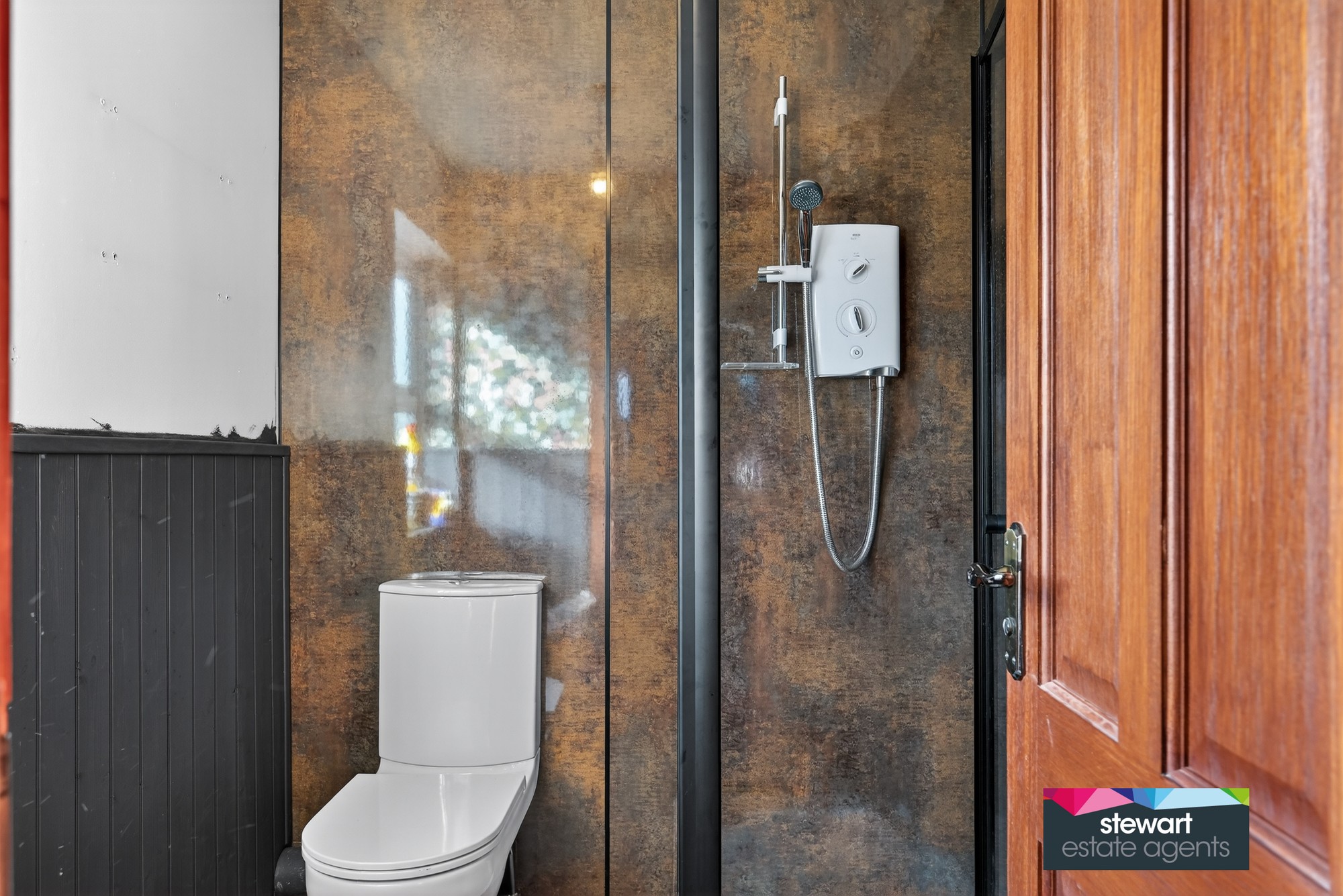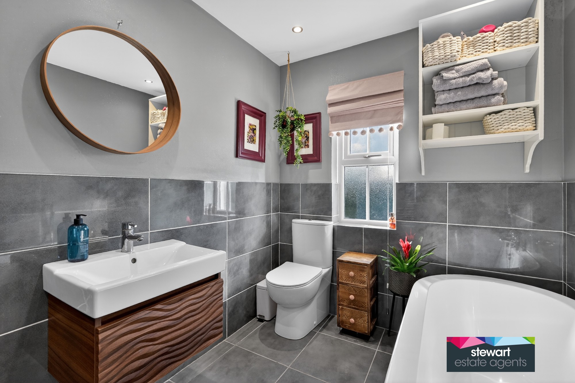 Beautiful contemporary style bathroom with a free standing bath, WC and wash hand basin. Shower cubicle with a fitted shower fitment. Partially tiled walls with feature tiles