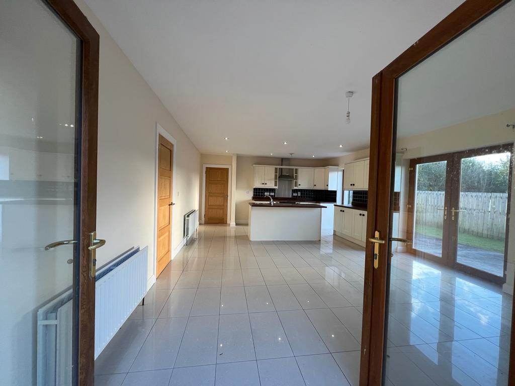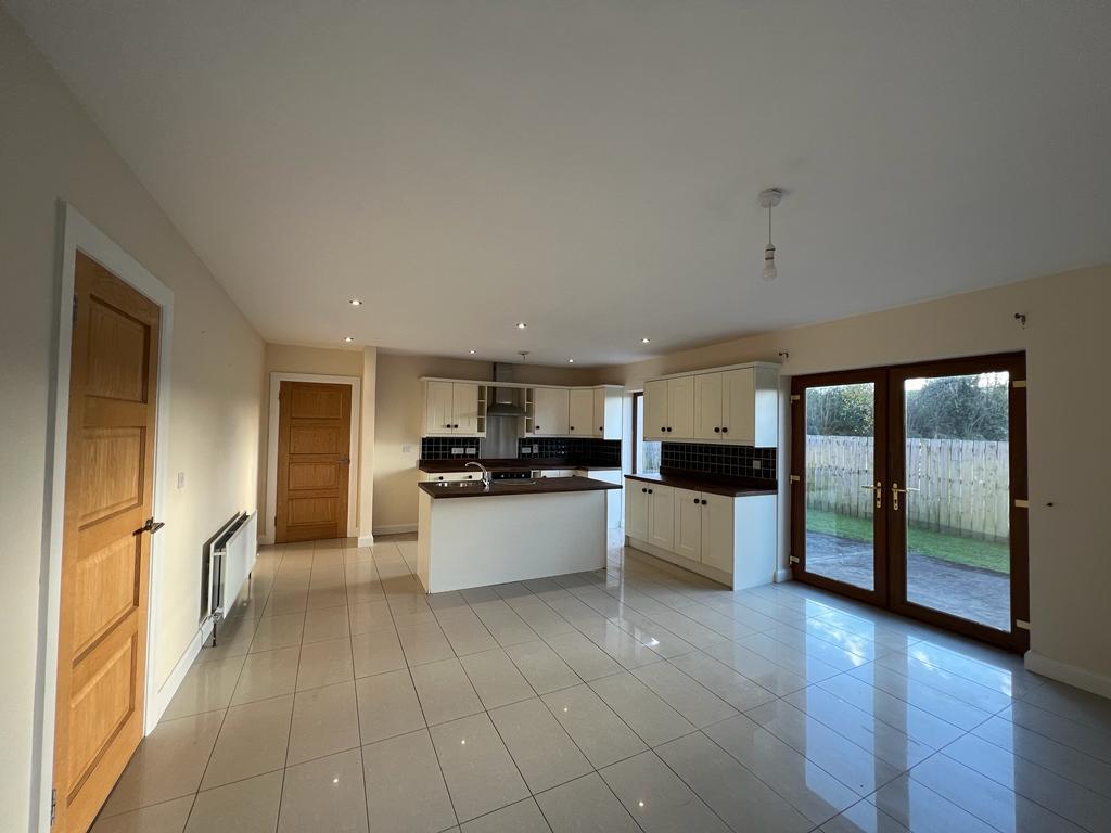 Having range of eye and low level units, tiling between units, hob, underoven, stainless steel extractor hood, centre island having sink unit with mixer taps and storage under, breakfast bar, plumbed for dishwasher, French doors to side and rear, recessed lighting, tiled floor.