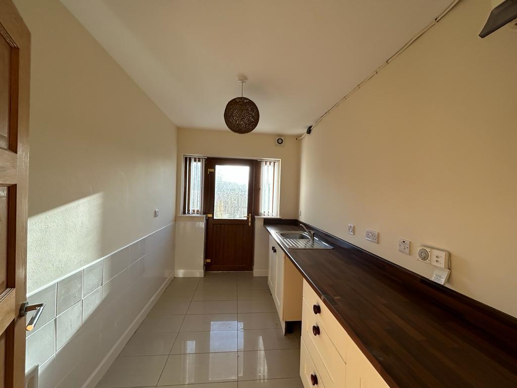 Having low level units, single drainer stainless steel sink unit with mixer taps, plumbed for washing machine, tiled floor.