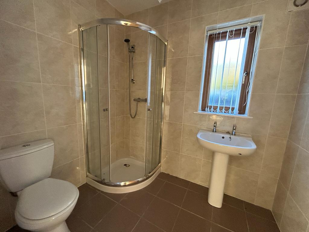 Comprising of walk in shower, WHB, WC, fully tiled walls and floor.